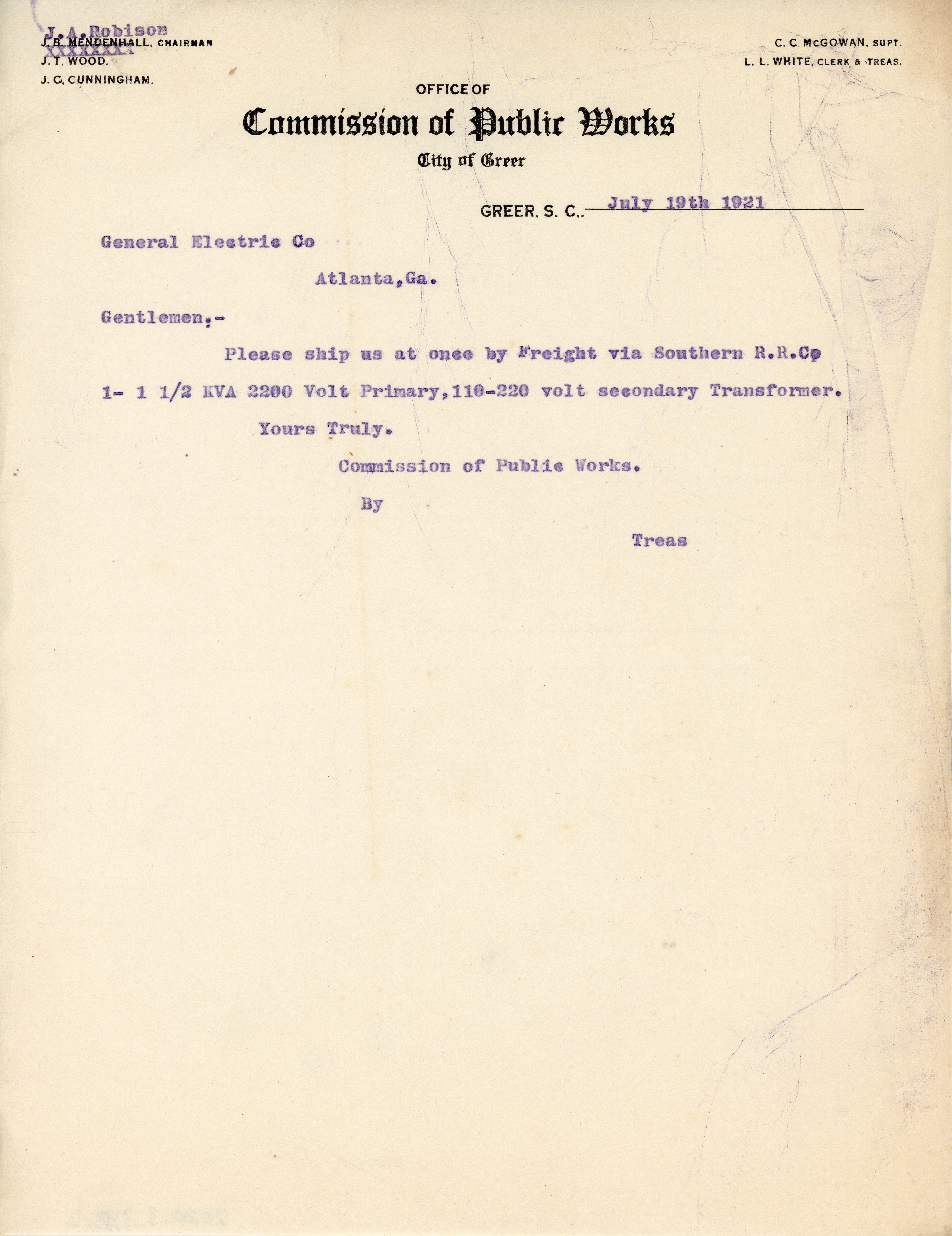 GREER, S.C. July 19th 1921