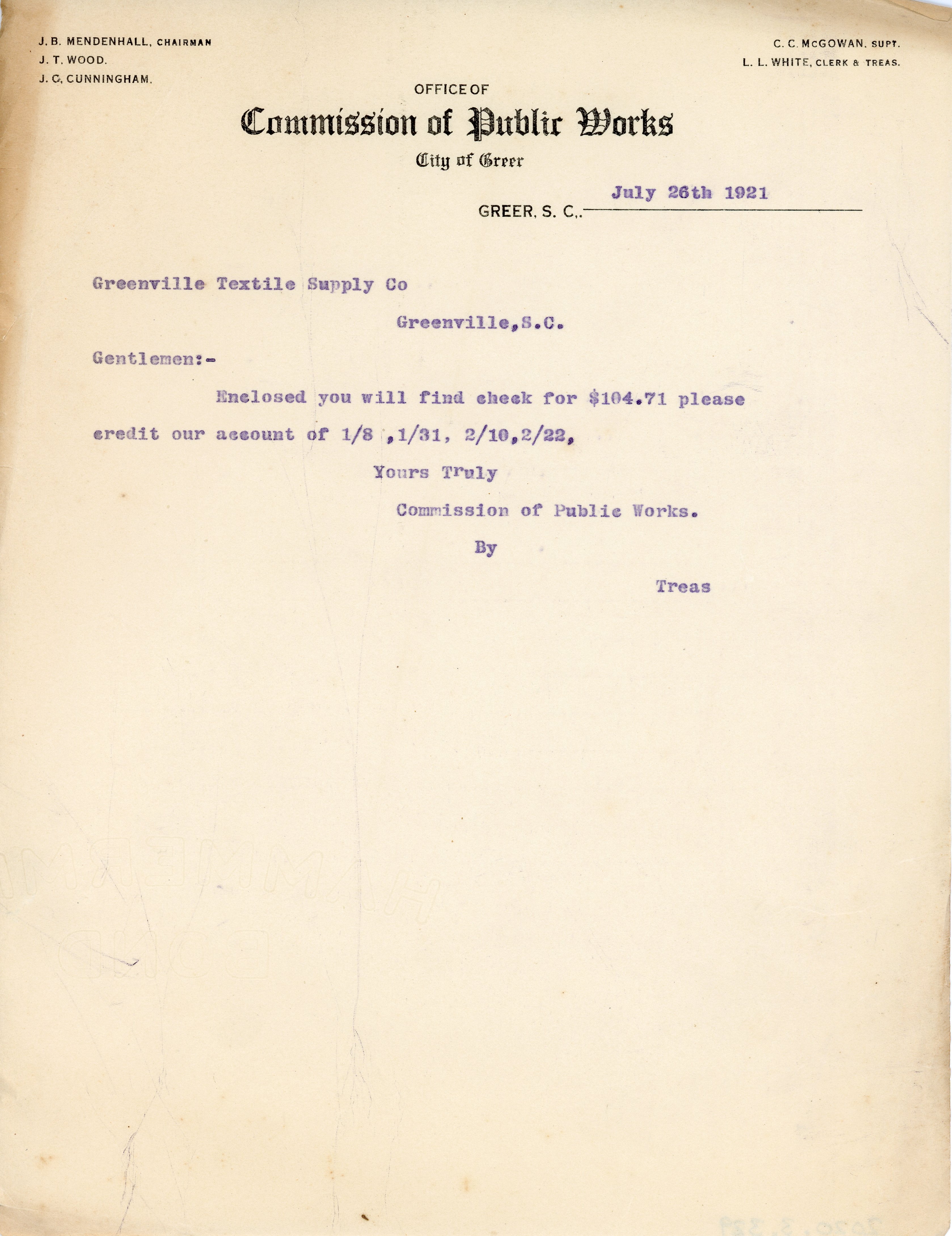 - Letter 26 July 1921 L. L. White to Greenville Textile Supply Co.