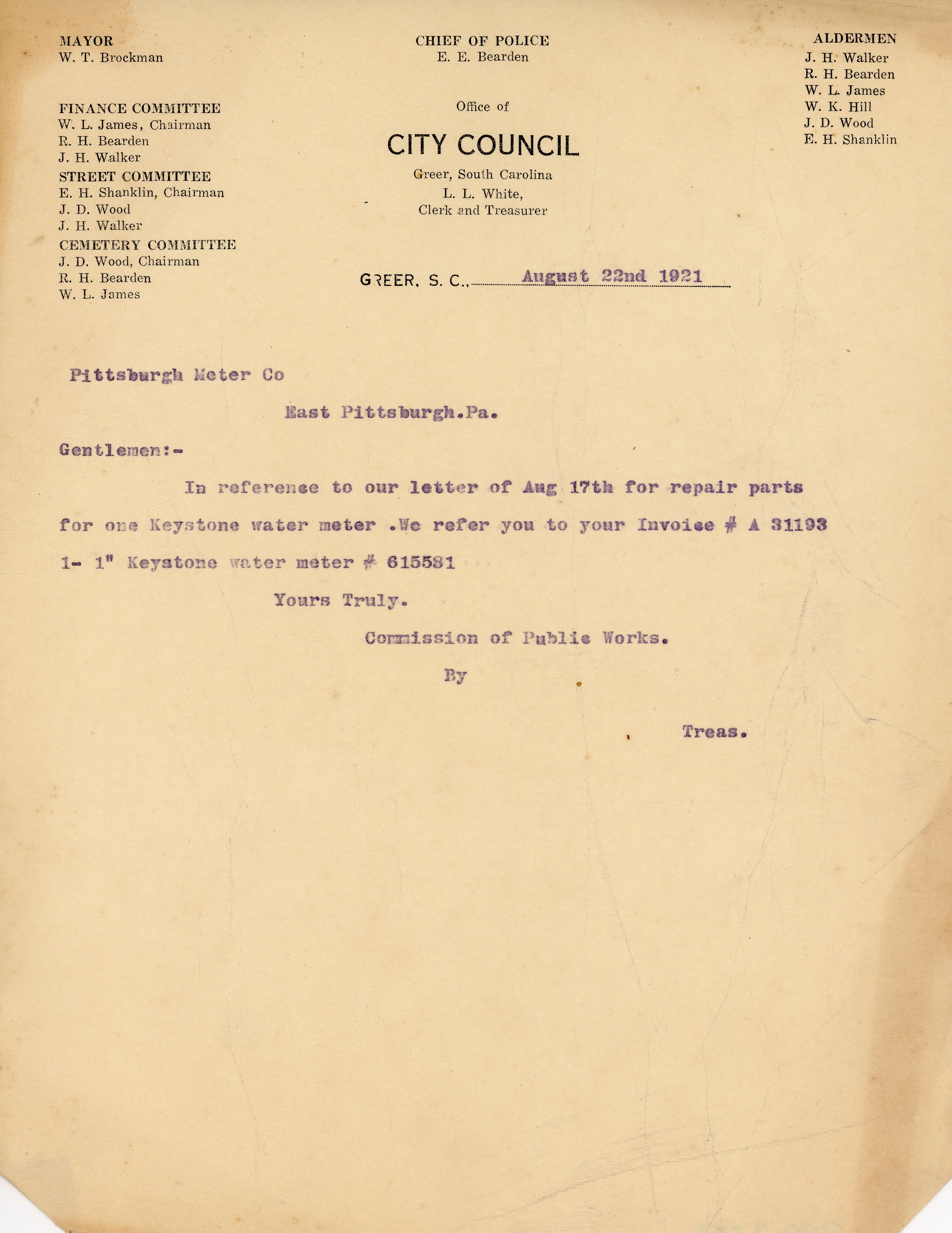 - Letter 22 August 1921 L. L. White to Pittsburgh Meter Co.