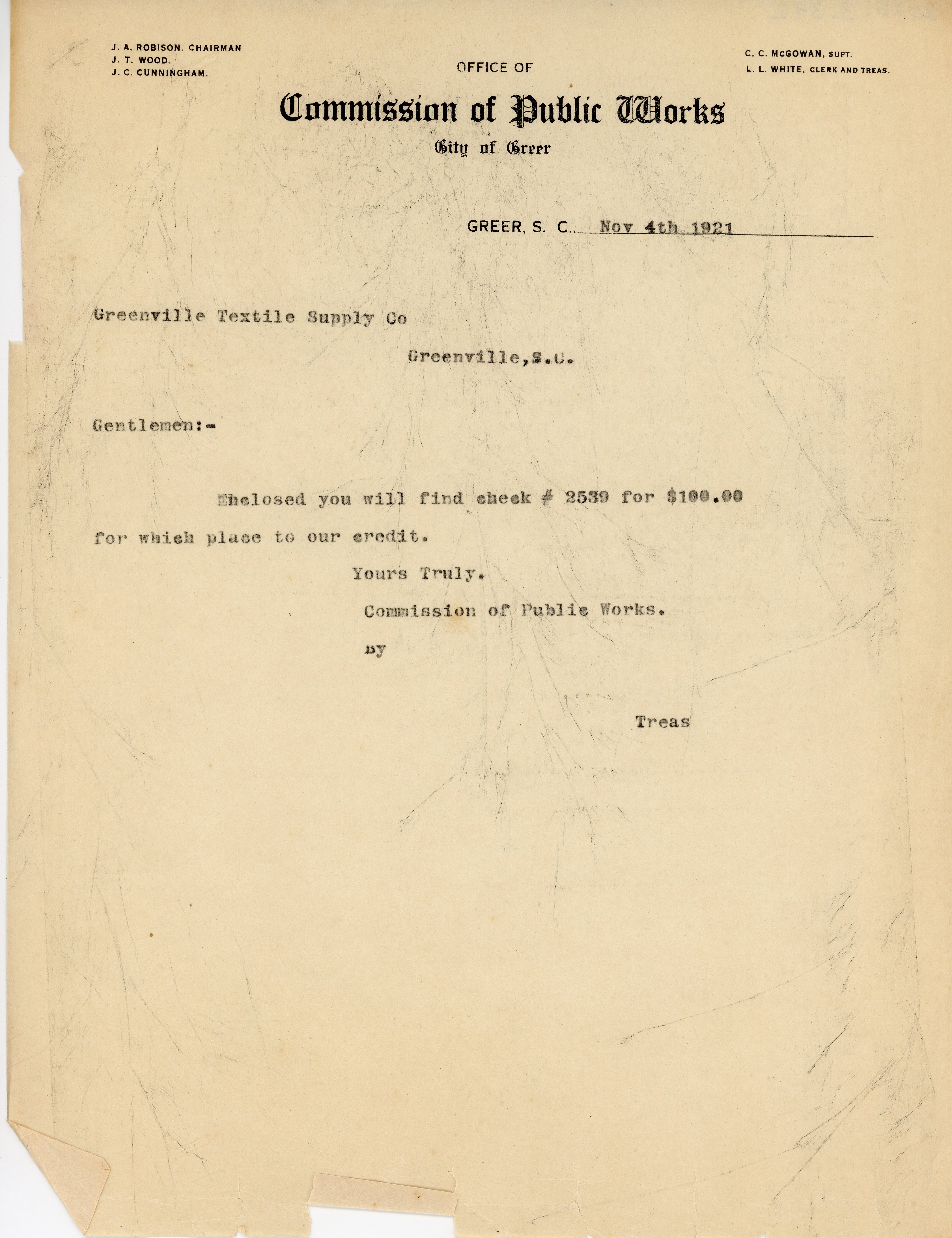 - Letter 4 November 1921 L. L. White to Greenville Textile Supply Co.
