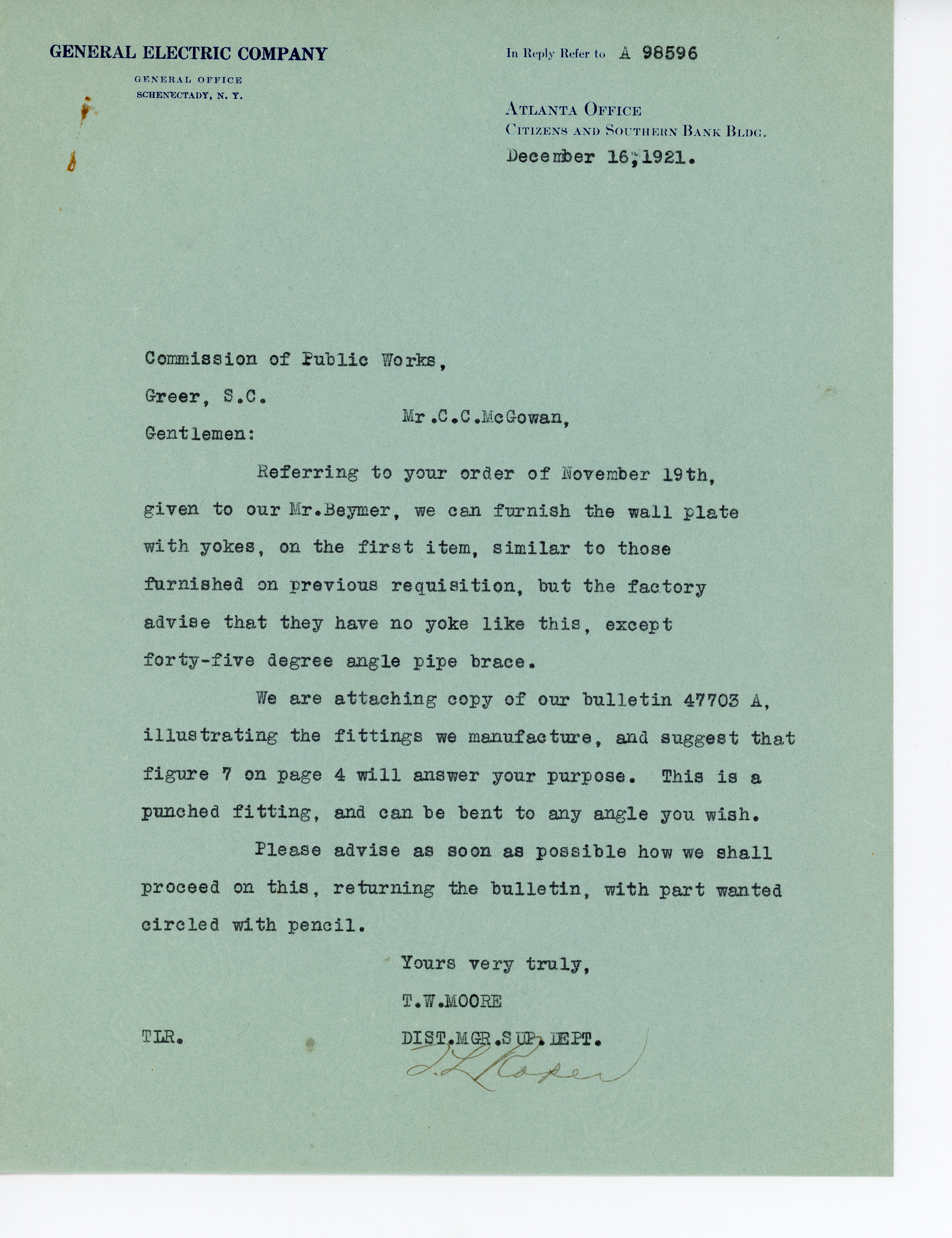 - Letter 16 December 1921 T. L. R. [illegible] to Commission of Public Works