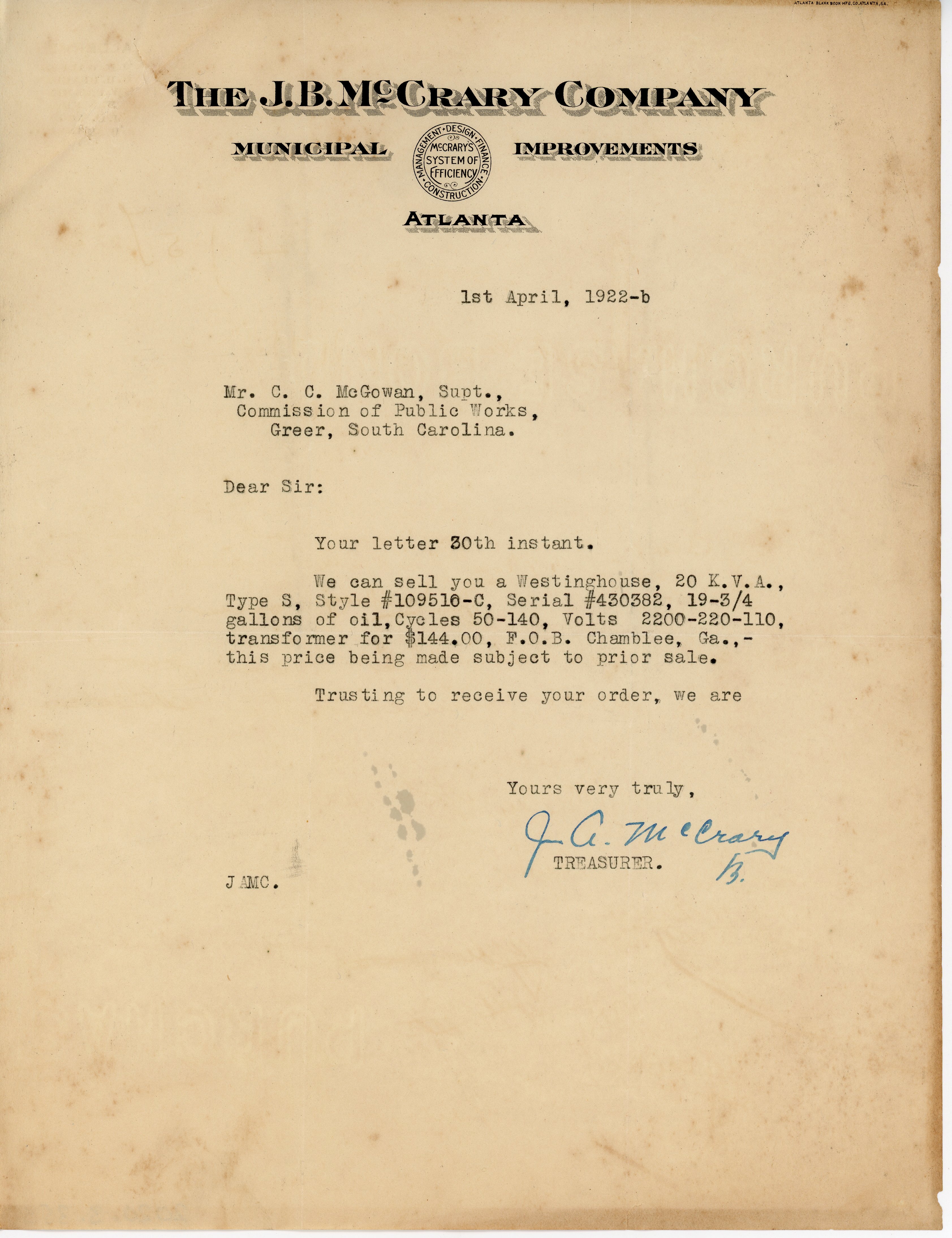 - Letter 1 April 1922 J. A. McCrary to C. C. McGowan