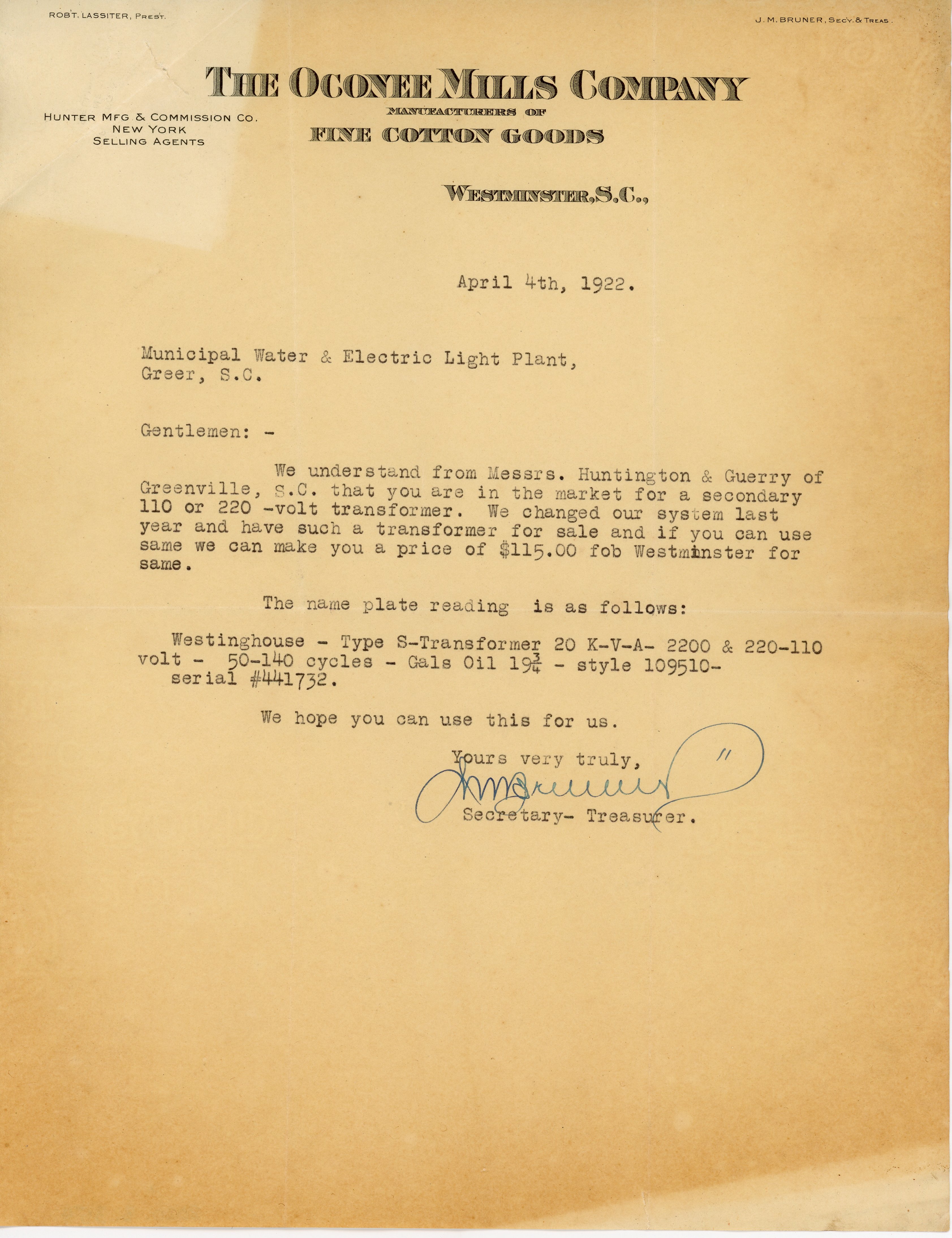 - Letter 4 April 1922 J. M. Bruner to Municipal Water & Electric Light Plant