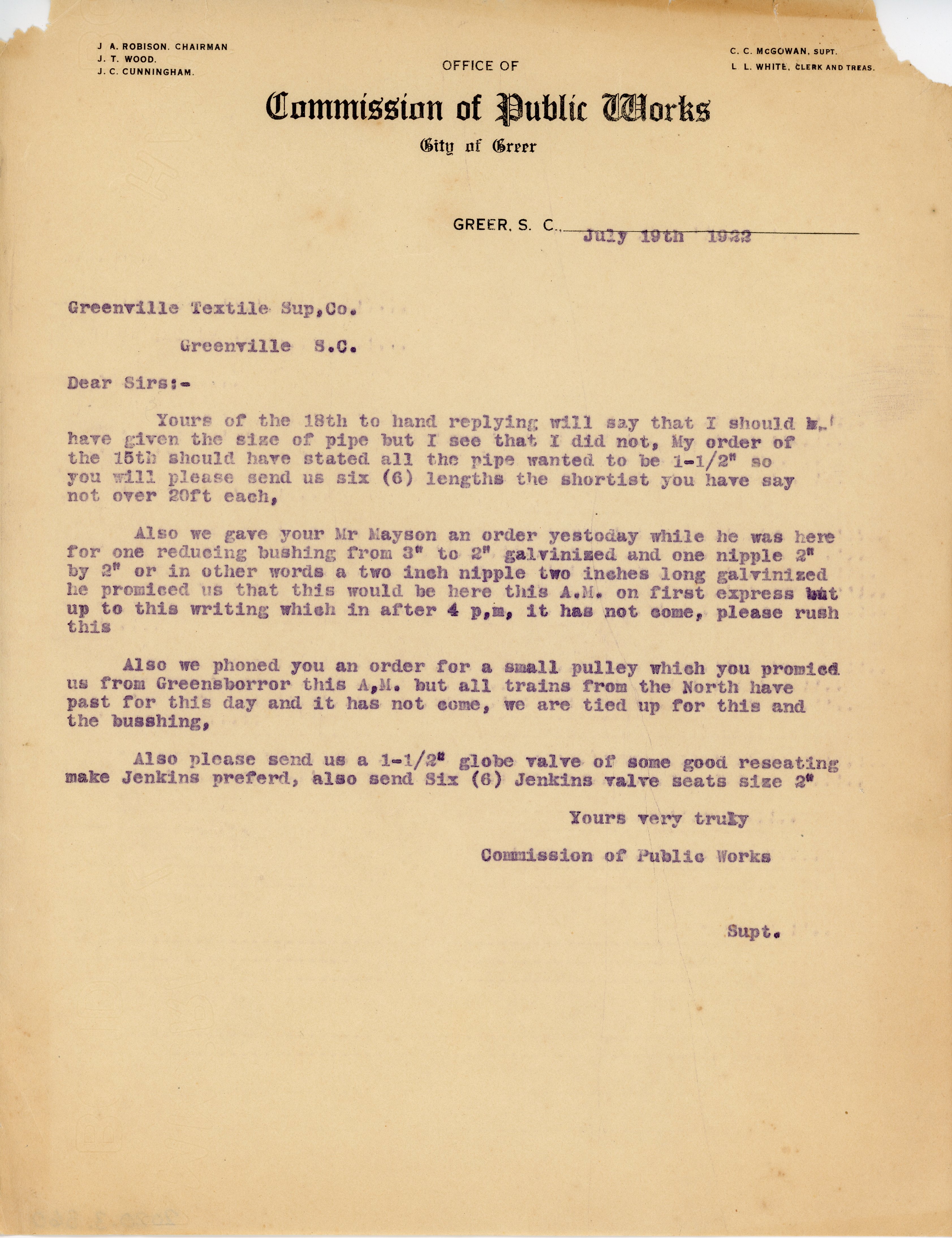 - Letter 19 July 1922 C. C. McGowan to Greenville Textile Sup. Co.