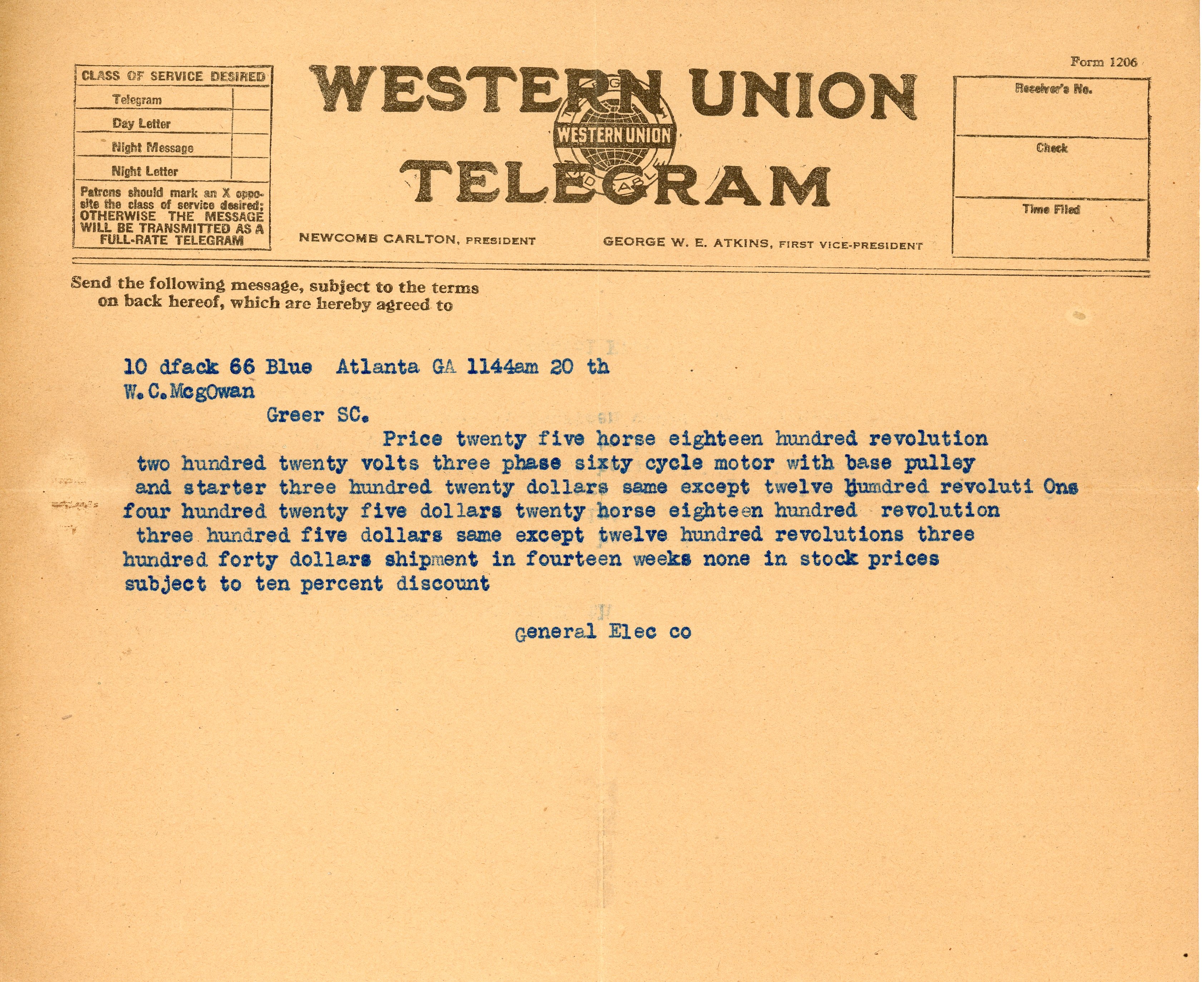 - Western Union Telegram General Electric Co. W. C. McGowan