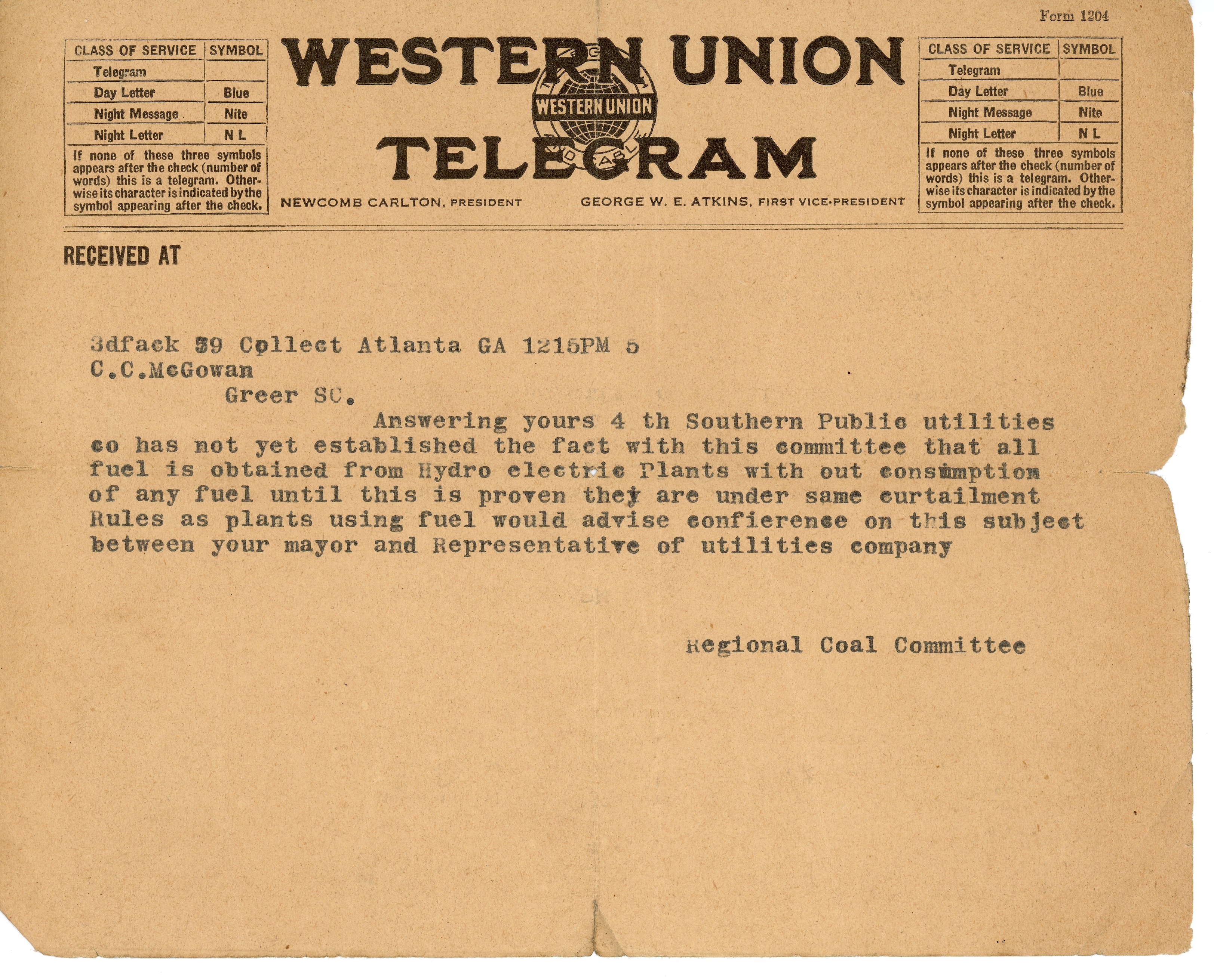 - Western Union Telegram Regional Coal Committee to C. C. McGowan