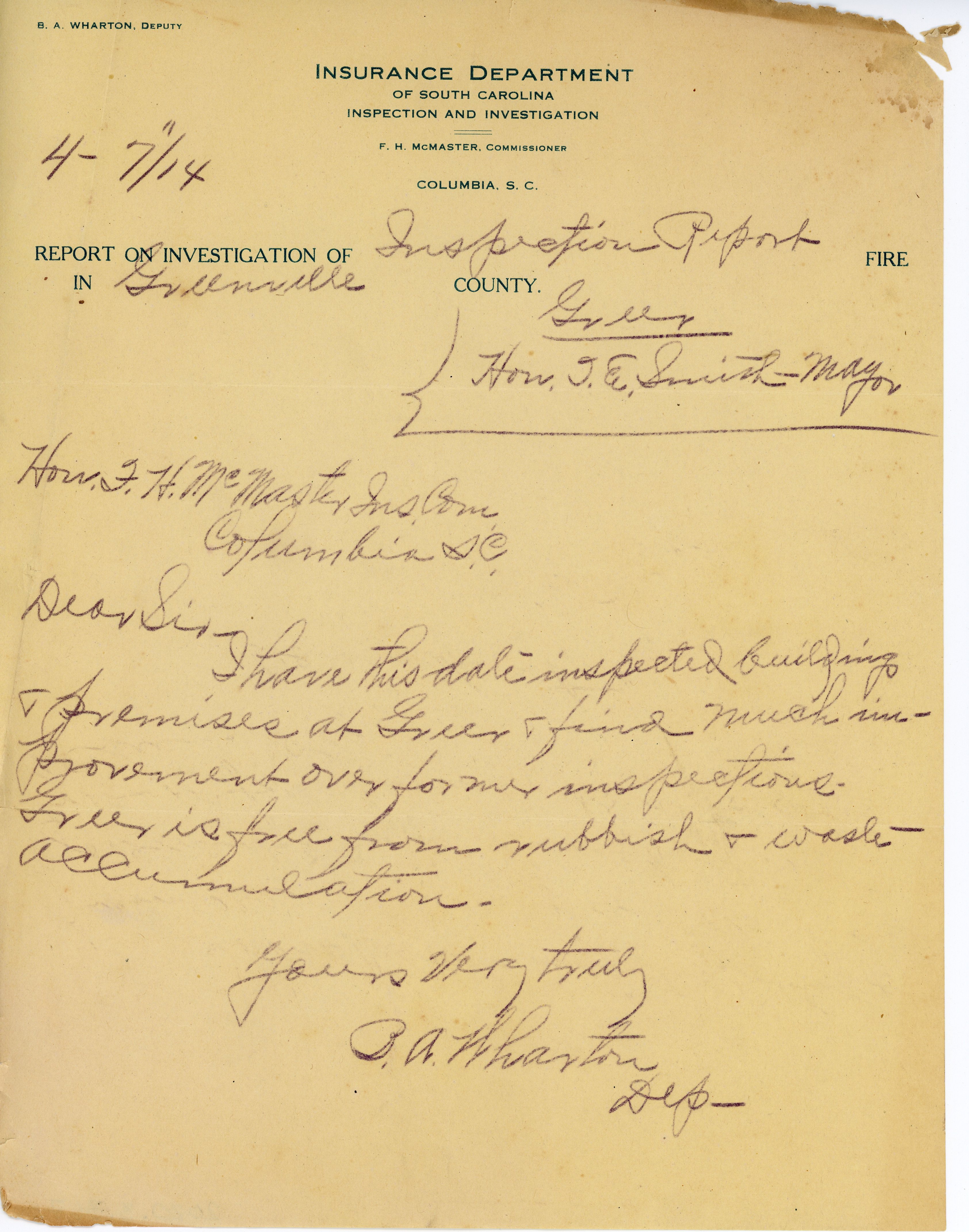 - Letter 7 April 1914 B.A. Wharton to Honorable F. H. McMaster