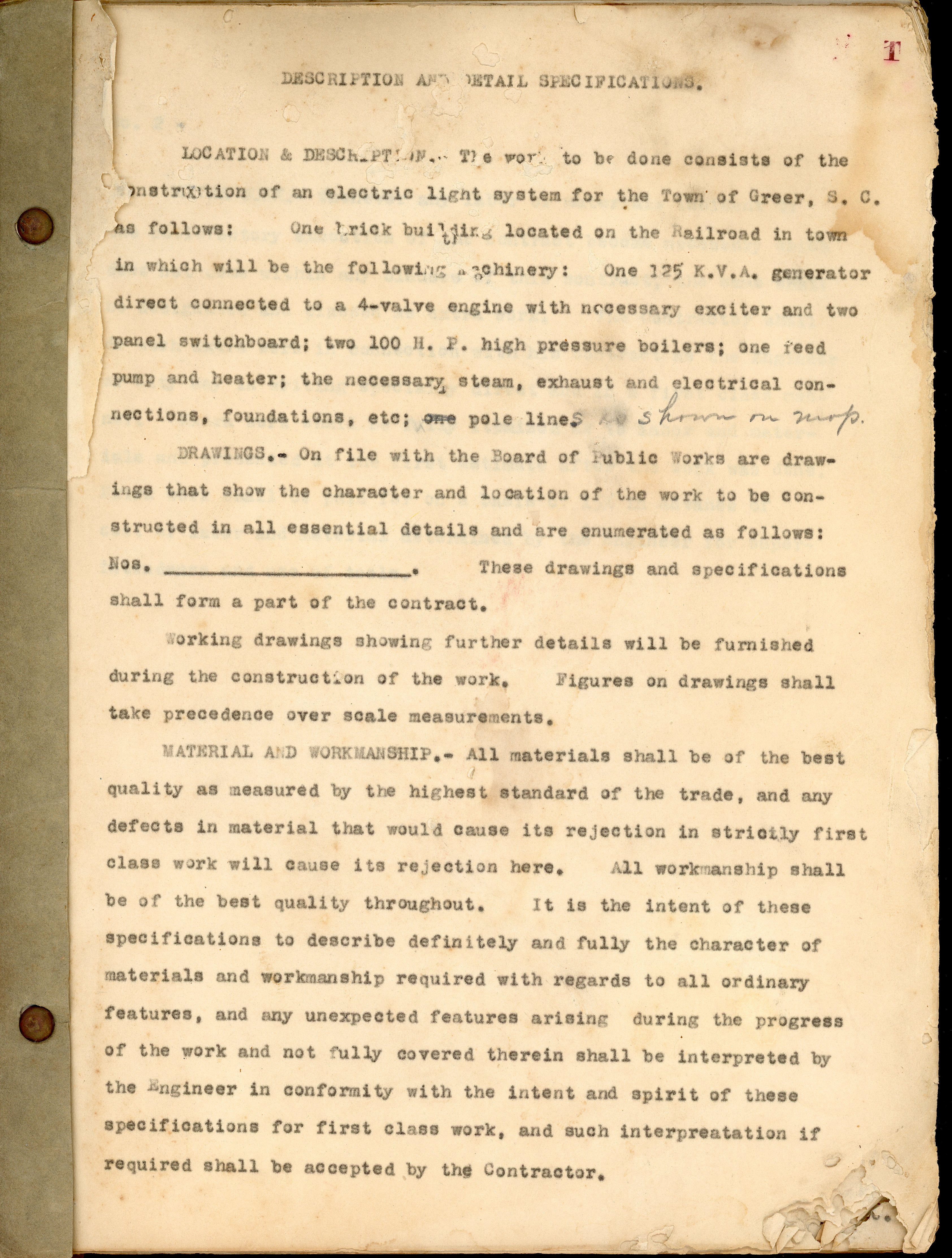 - Manual Description and Detail Specifications of Electric Light System for the Town of Greer, S. C.