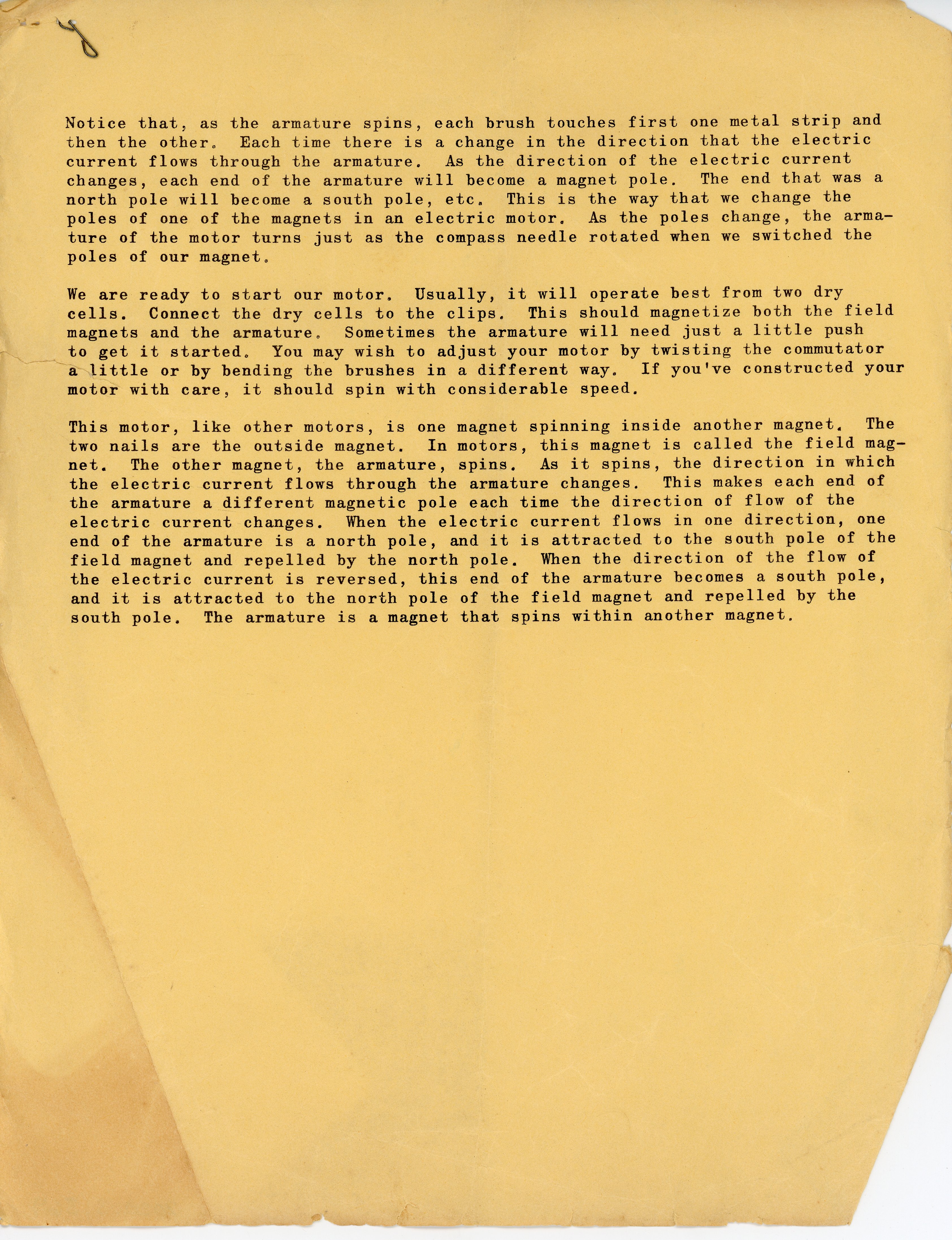 one field magnet at a height level with the commutator. Scrape the insulation off the end of this wire and adjust it so that it will brush against the com-