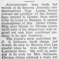 On August 2, 1941, a Greenville News article reported that Lucas, the former owner of the Citizen, had purchased the Seneca Journal and was moving to Seneca.