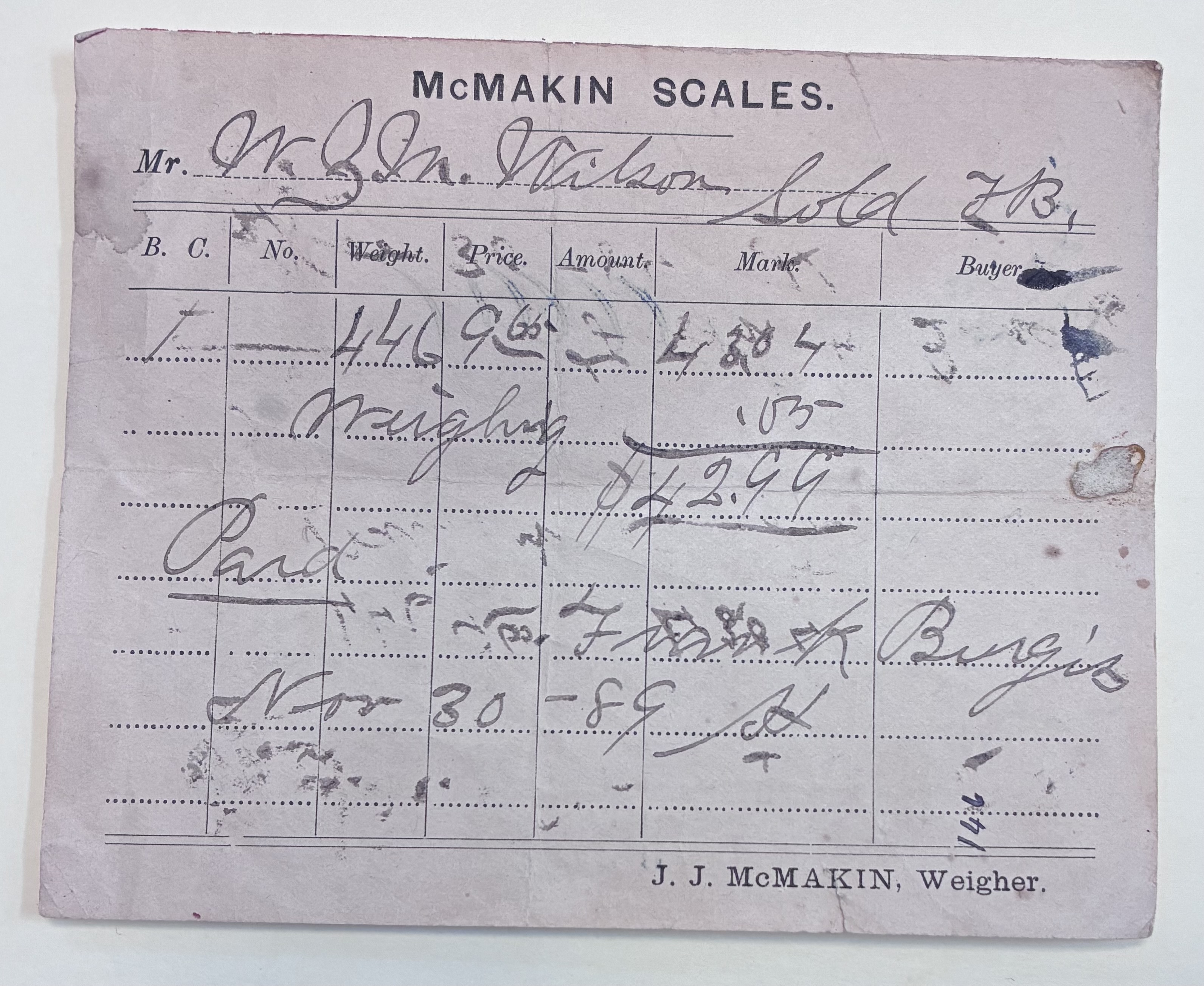 Part of Cotton Receipt from W.Z.M. Wilson to Frank Burgiss, November 30, 1889