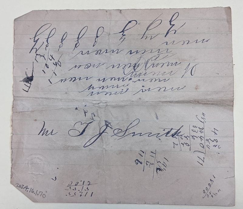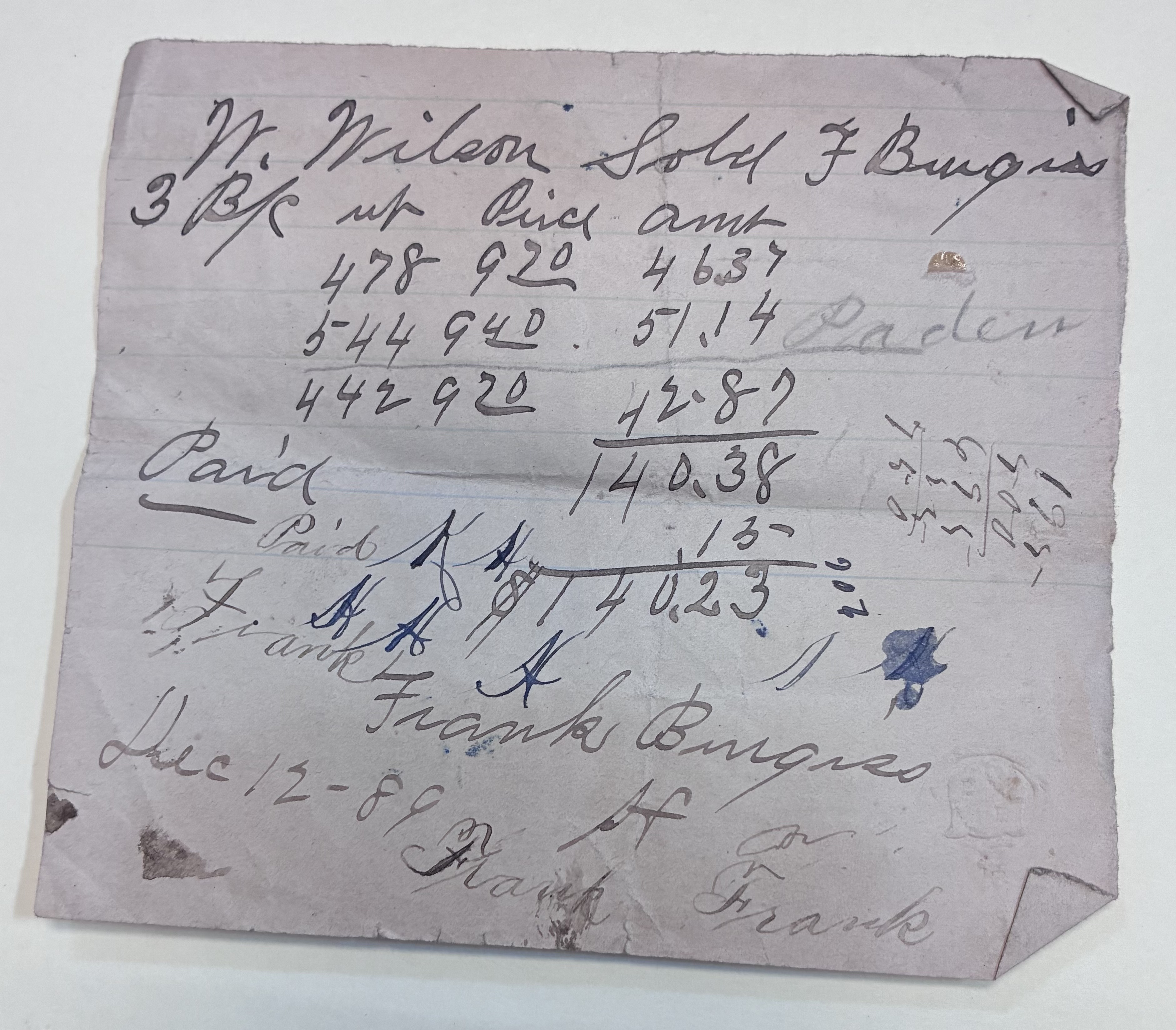 Front: Cotton receipt W. Wilson 3 Bales of cotton sold to Frank Burgis, December 12, 1889