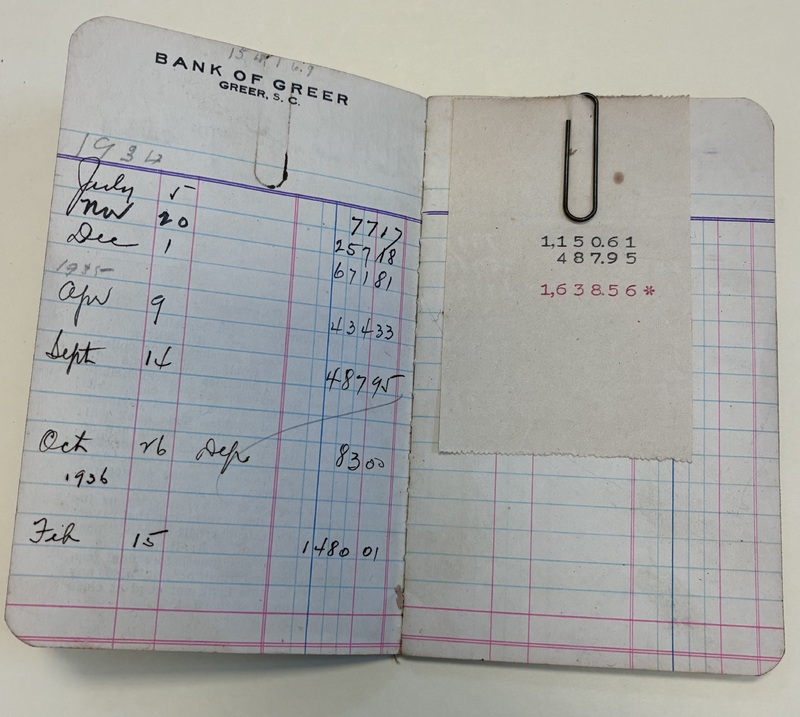 - Bank of Greer Deposit Book for W.Z.M. Wilson, Greer, S.C., 1934-1936