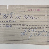 - $300.00 Six months after payment order to W.Z.M. Wilson at Peoples State Bank of South Carolina, Greer Branch, Greer, S.C., from J.O Hendrix, October 22,1931