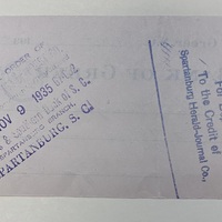 Part of Check from W.J.M. Wilson to The Spartanburg Herald, Greer, S.C., November 5, 1935