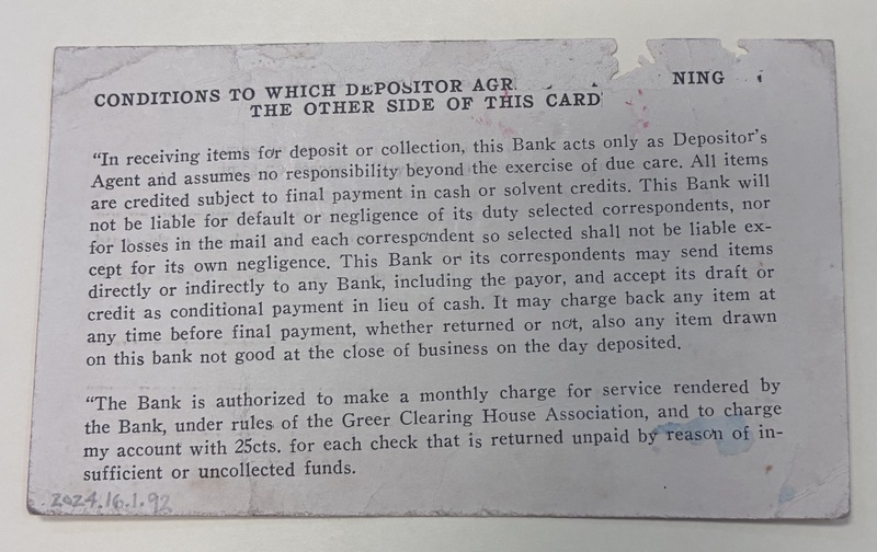 Bank of Greer Transaction Authorization Card, Greer, S.C.