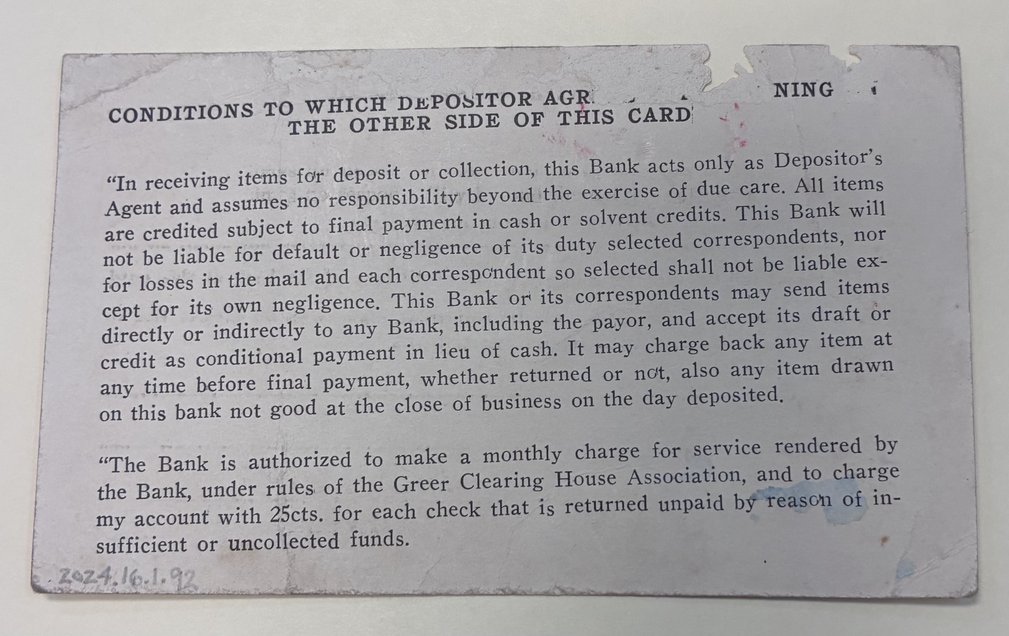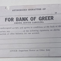 Part of Bank of Greer Transaction Authorization Card, Greer, S.C.