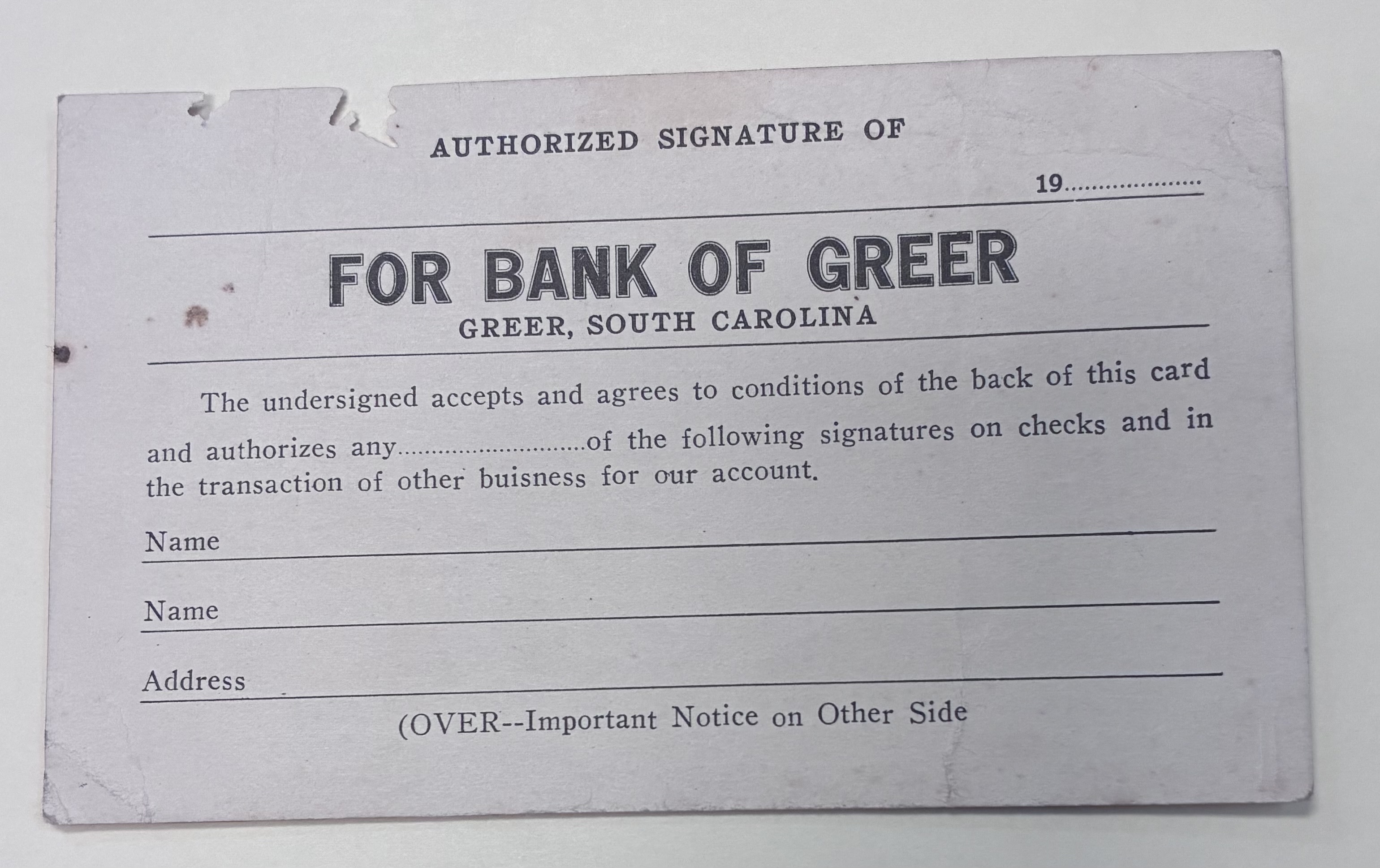 - Bank of Greer Transaction Authorization Card, Greer, S.C.