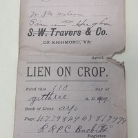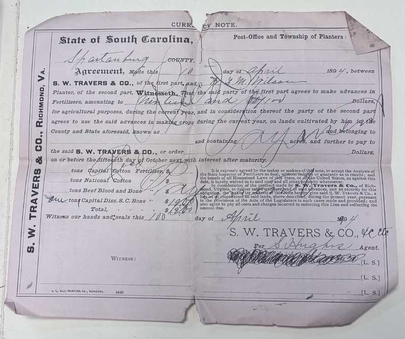 Inside: Currency note, fertilizer advancement agreement W.Z.M Wilson to S Hughes Agent for S.W. Travers & Co., Richmond, VA, Spartanburg, SC, April 10, 1894