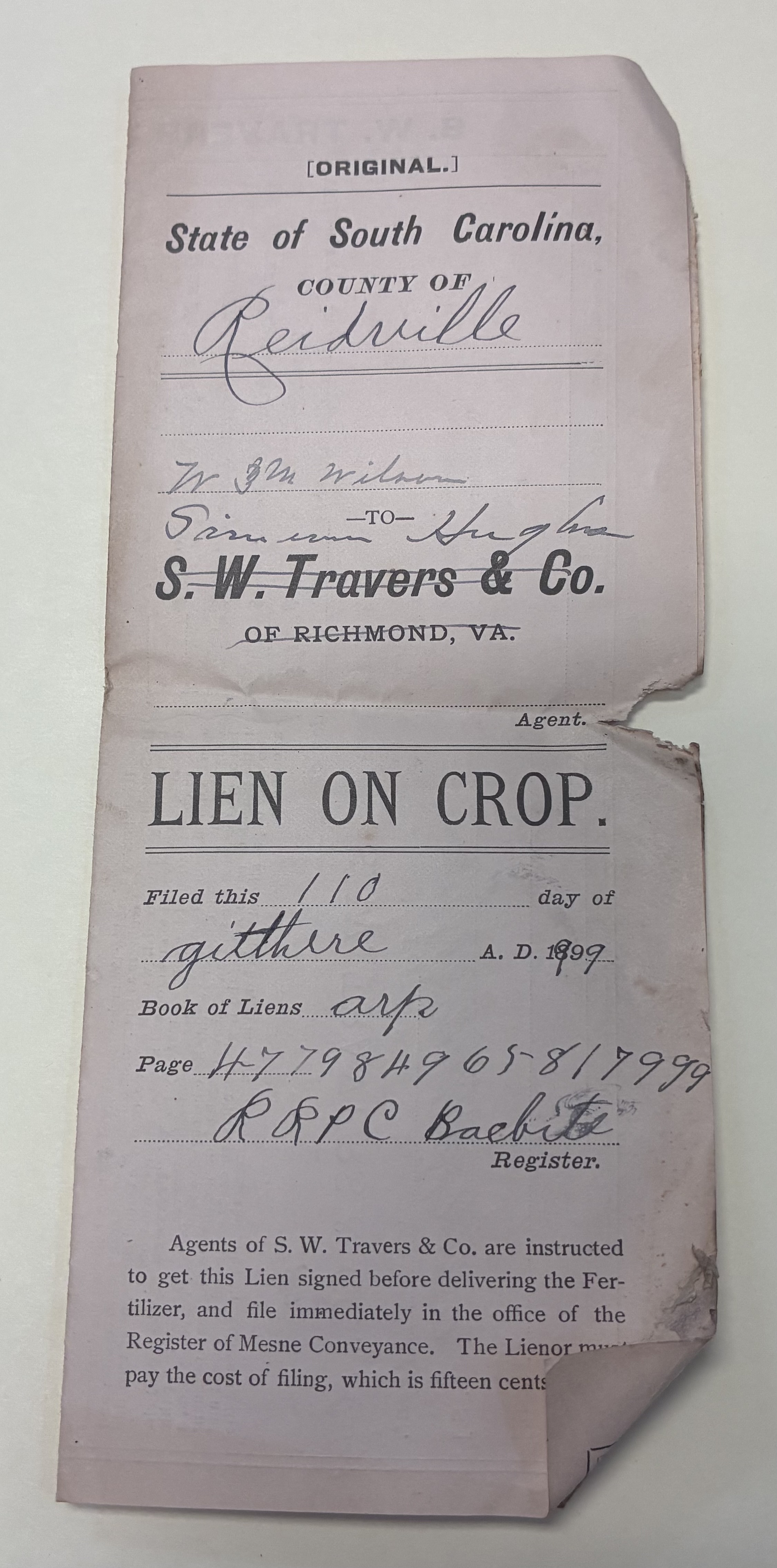 Front: Lien on crop W.Z.M. Wilson to S Hughs 110 days, Reidville, SC