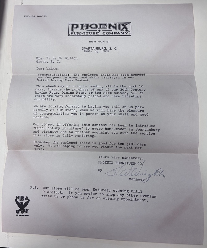 97.2 Typed congratulations letter to Mrs. W.Z.M. Wilson for winning Phoenix Furniture Company's dotted living room contest