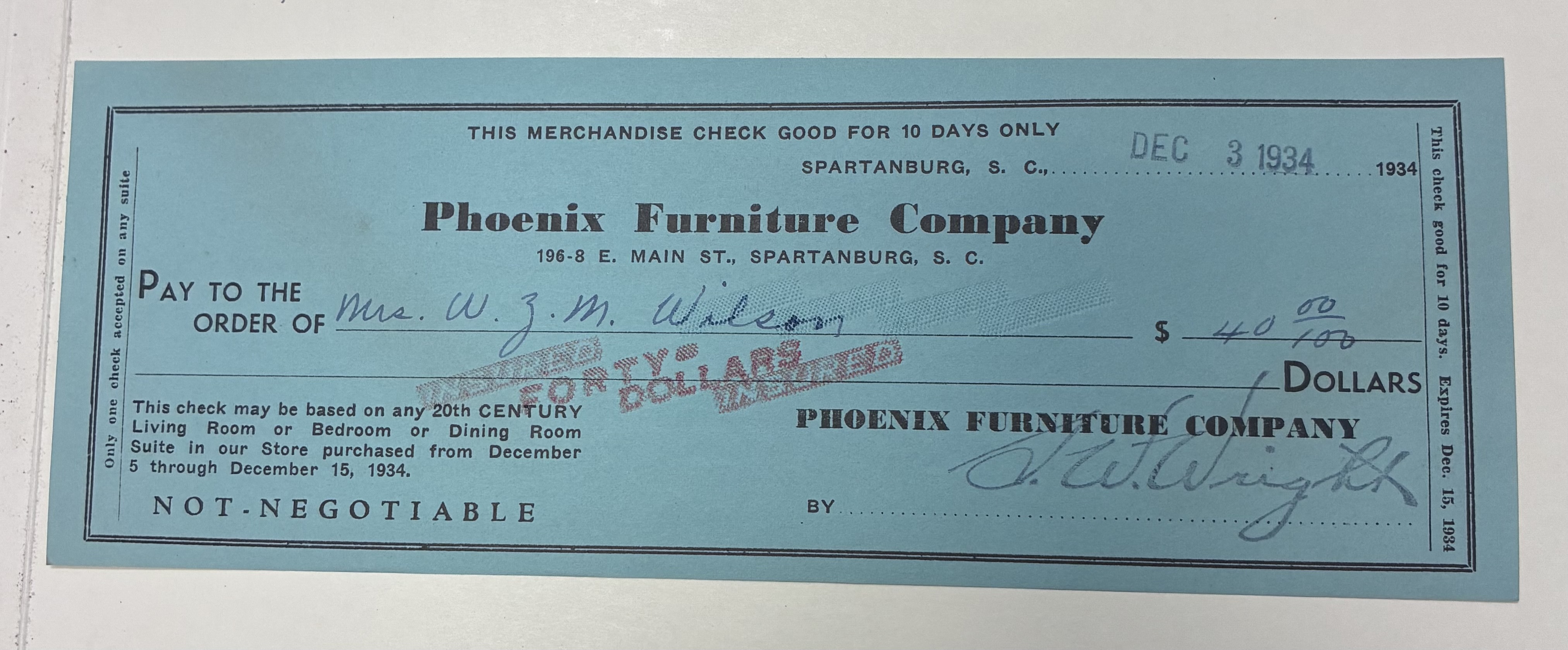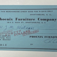 97.3 Green $40 merchandise check from Phoenix Furniture Company, Spartanburg, S.C., to Mrs. W.Z.M. Wilson