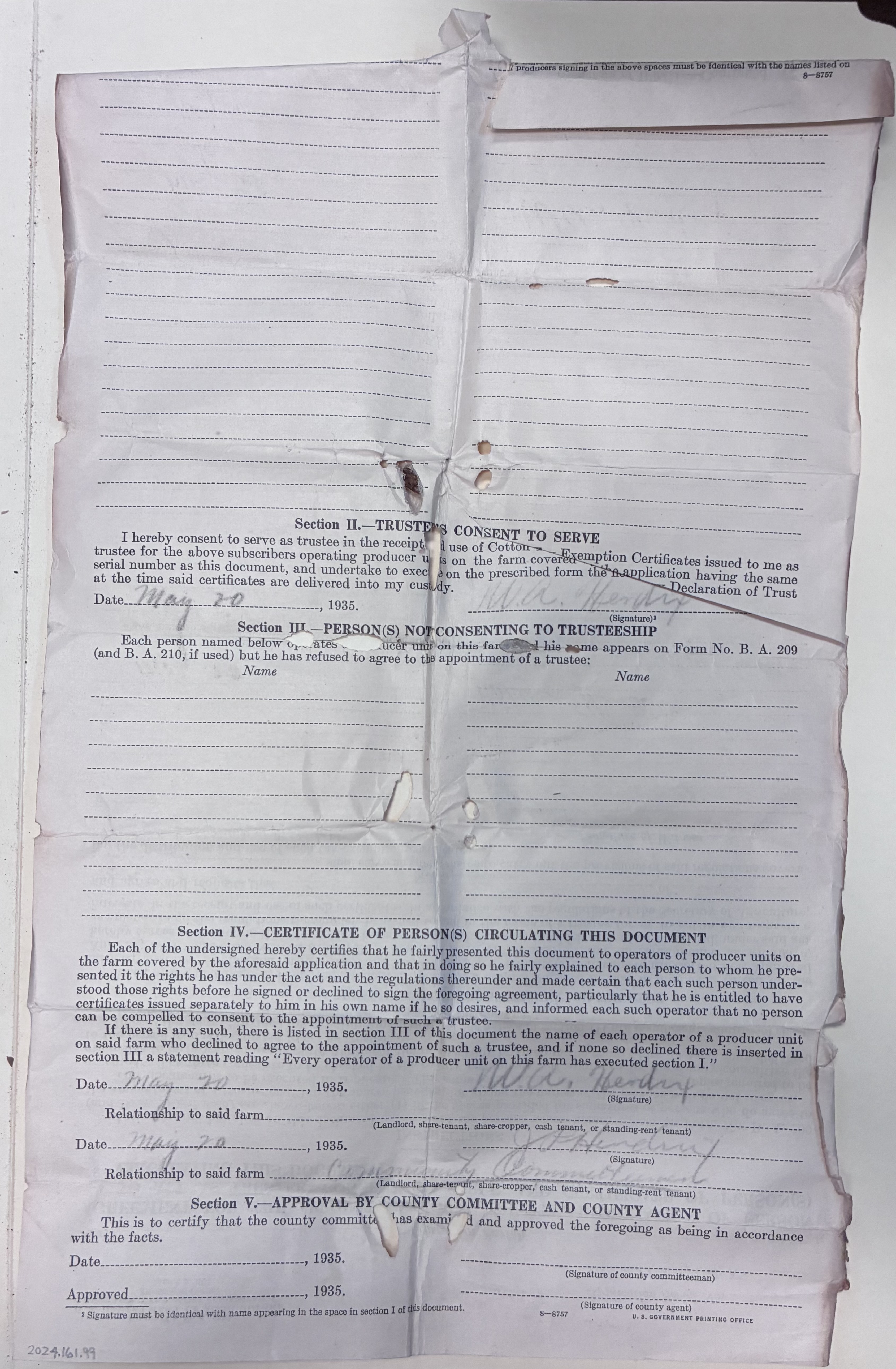 Certificate of person(s) circulating this document, W.A. Hendrix and J.O. Hendrix, relationship to farm community commitment, May 20, 1935 - Date