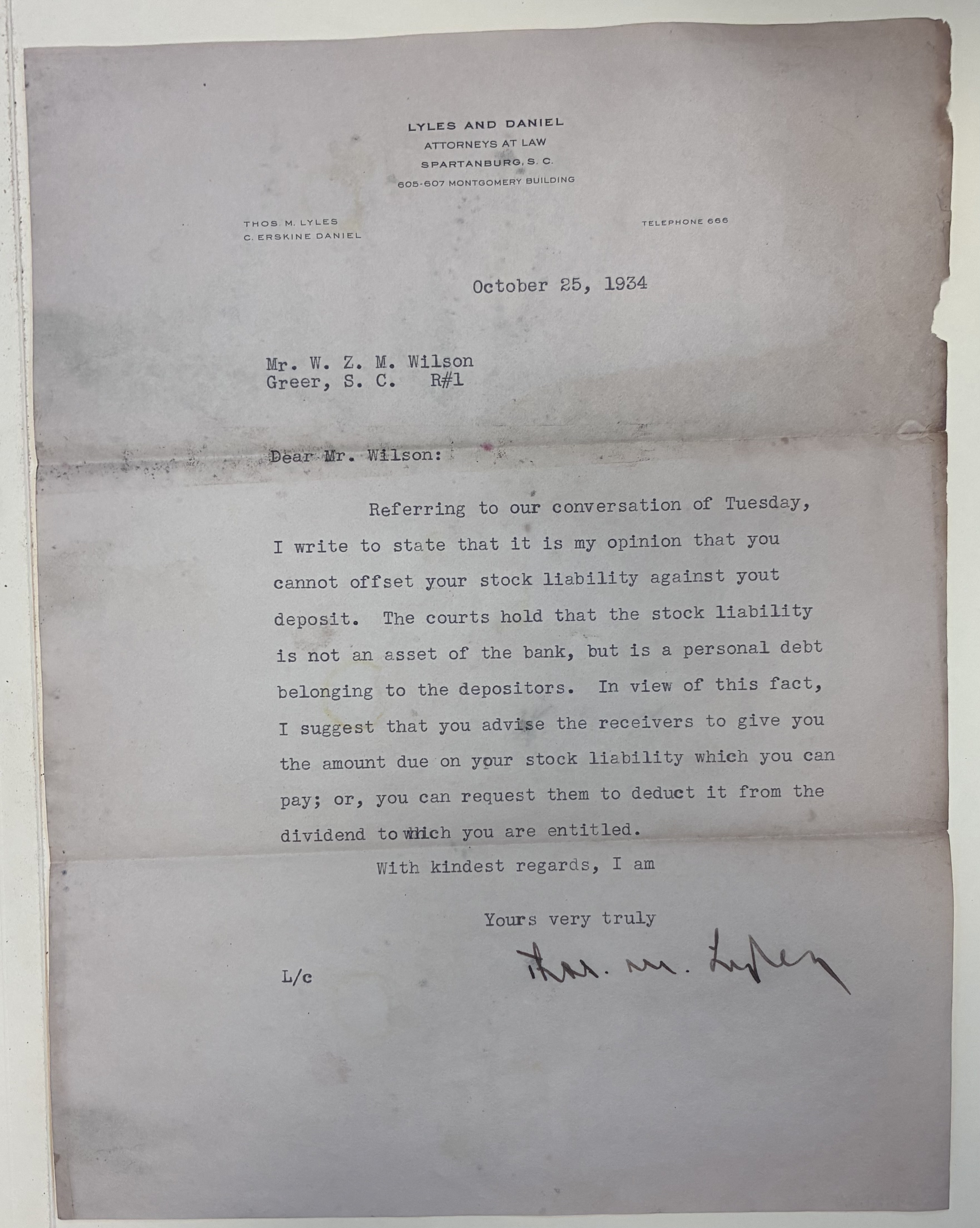 - Letter from Lyles and Daniel Attorneys to W.Z.M. Wilson regarding Mr. Wilson's stock liability, October 25, 1934