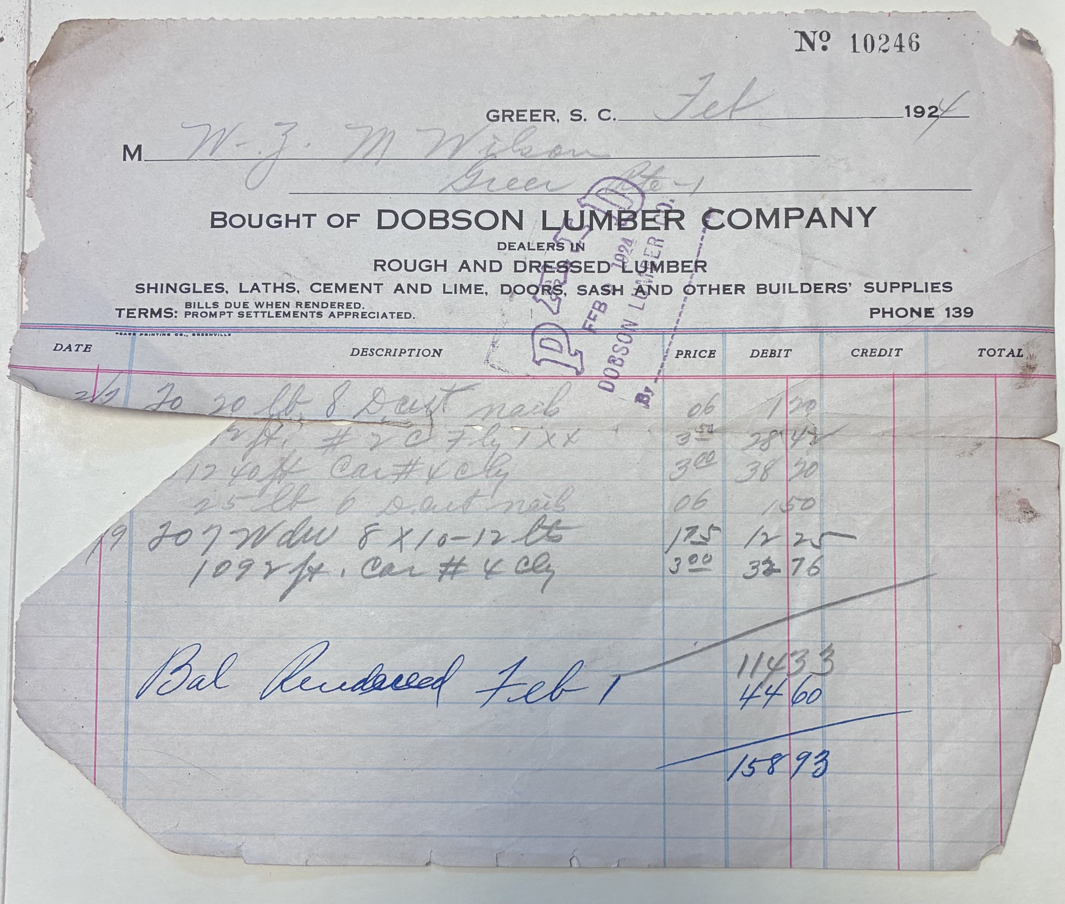 - Dobson Lumber Company Account Statement, Greer, S.C., February 1924