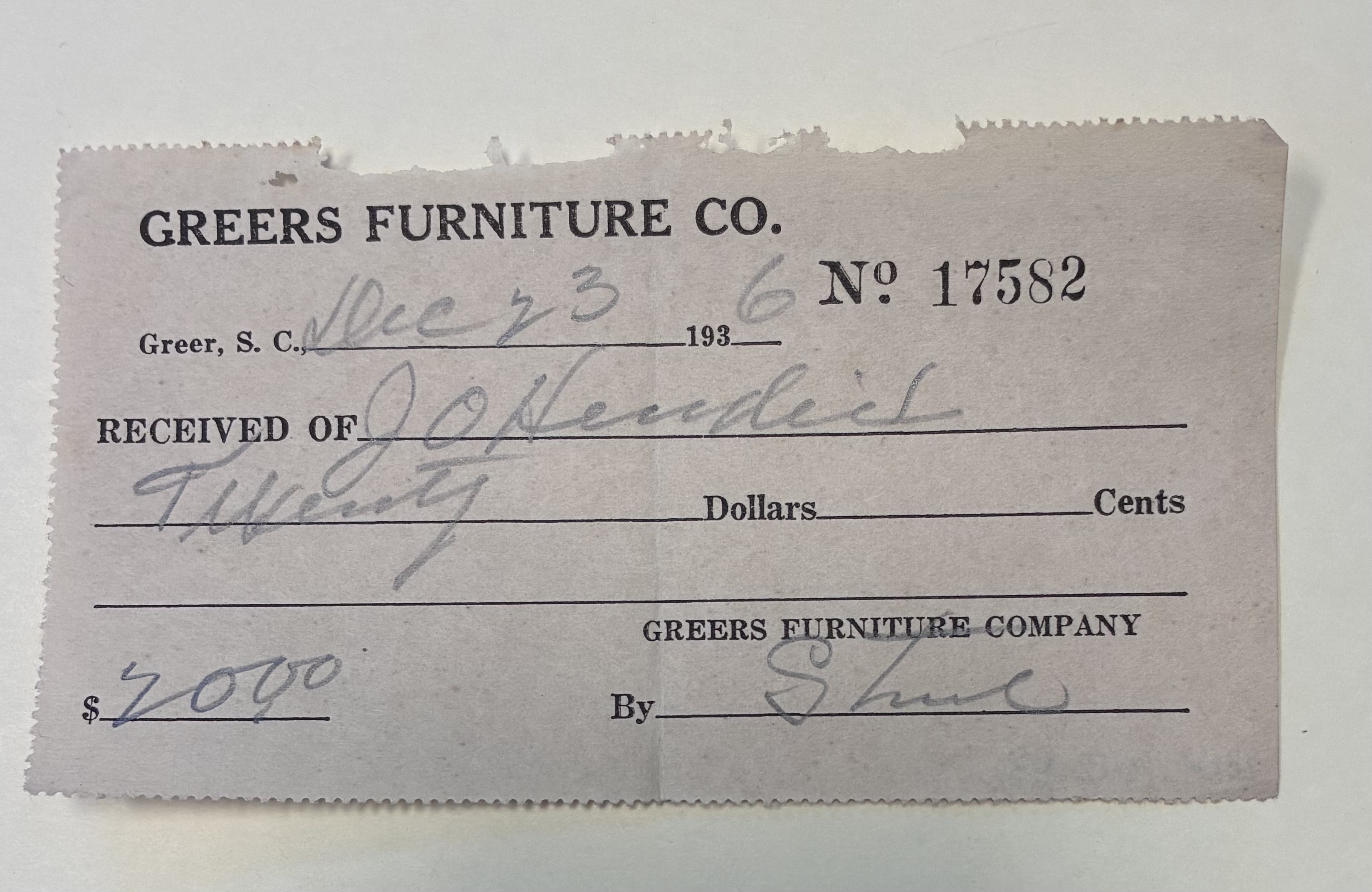 - Greer Furniture Co. Receipt, Greer, S.C., December 23, 1936