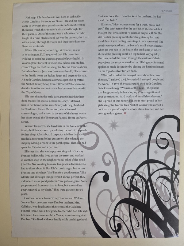 (2026.21.2) Article about Ella Jane Nesbitt, born in Asheville, North Carolina, but "her roots are Greer." - Creator