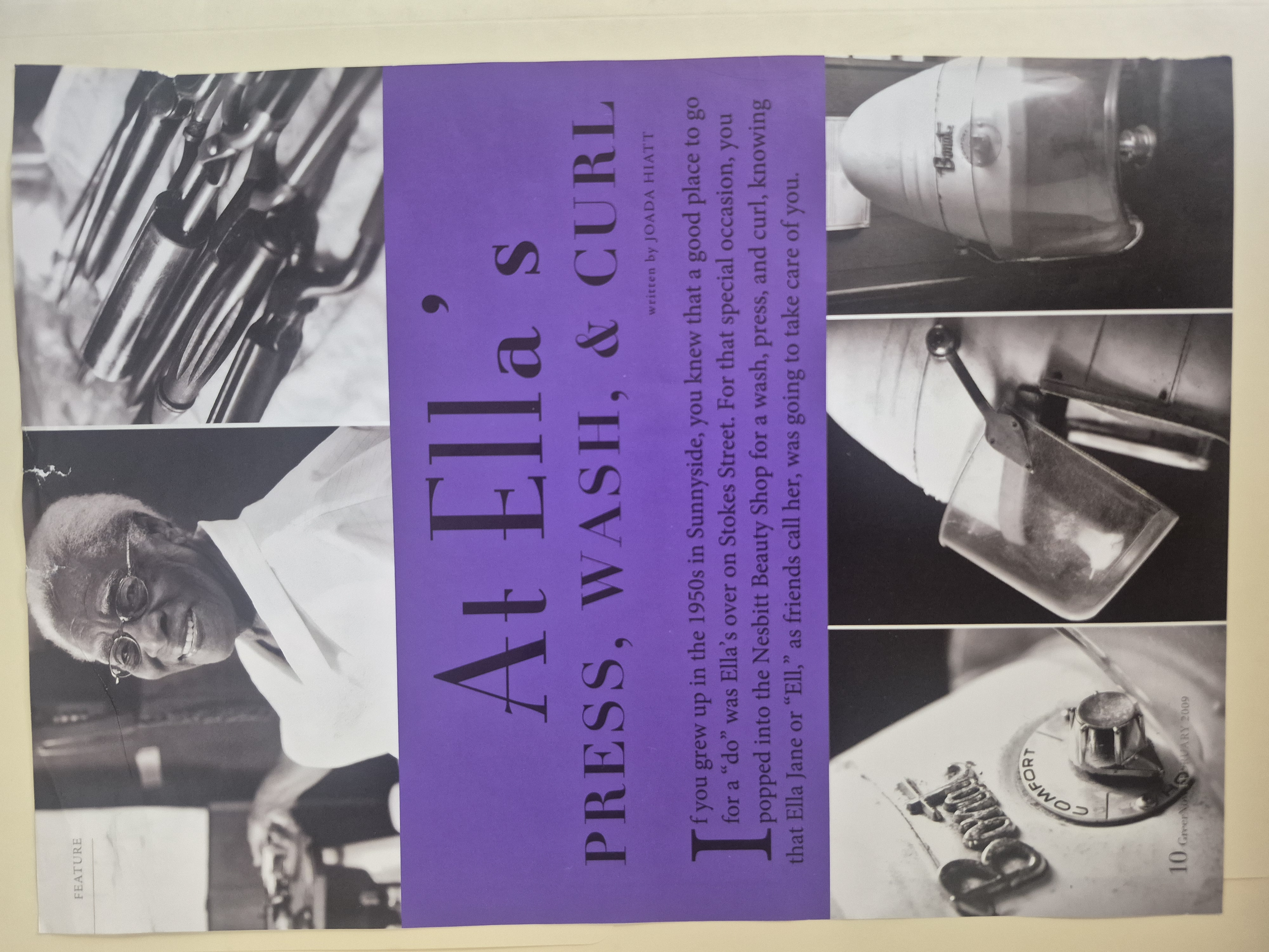 (2026.21.1) Cover of Article. Titled "At Ella's Press, Wash, & Curl" written by Joada Hiatt