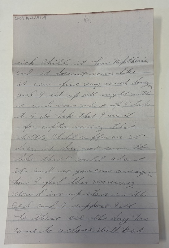 sick child it has Dipthera and it doesn't seem like it can fine very much longer and I sit up all night with it and now what if I take it I do hope that I wont for after seeing that little child supper as it does it does not seem tho like that I could start it and so you can [illegible] how I feel this morning Maud is upstairs in the Bed and I suppose Ill be there one the day has come to a close Well Dear