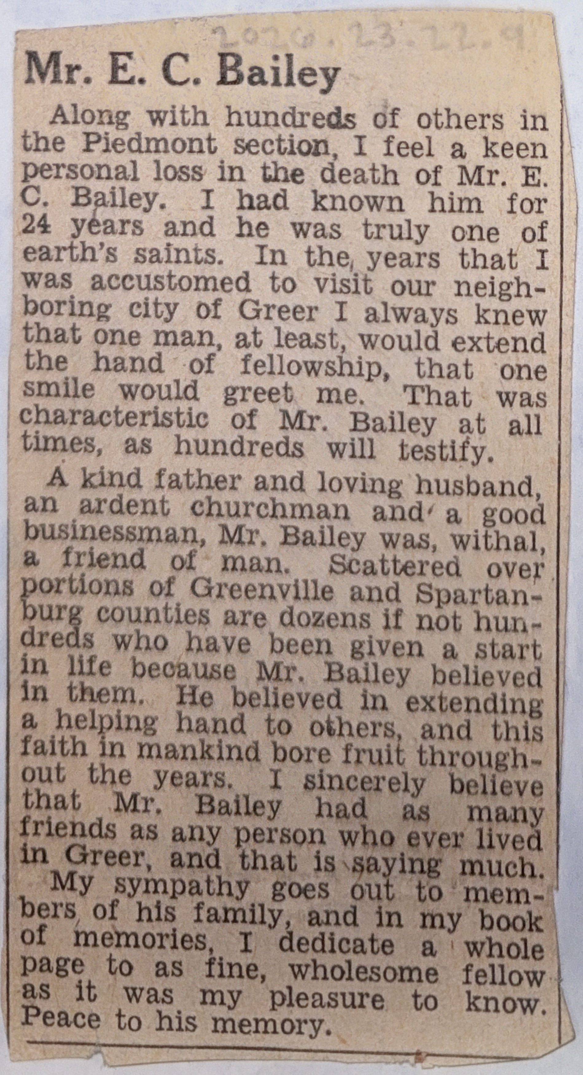 Along with hundreds of others in the Piedmont section, I feel a keen personal loss in the death of Mr. E. C. Bailey. I had known him for 24 years and he was truly one of earth’s saints. In the years that I was accustomed to visit out neighboring city of Greer I always knew that one man, at least, would extend the hand of fellowship, that one smile would greet me. That was characteristic of Mr. Bailey at all times, as hundreds will testify.