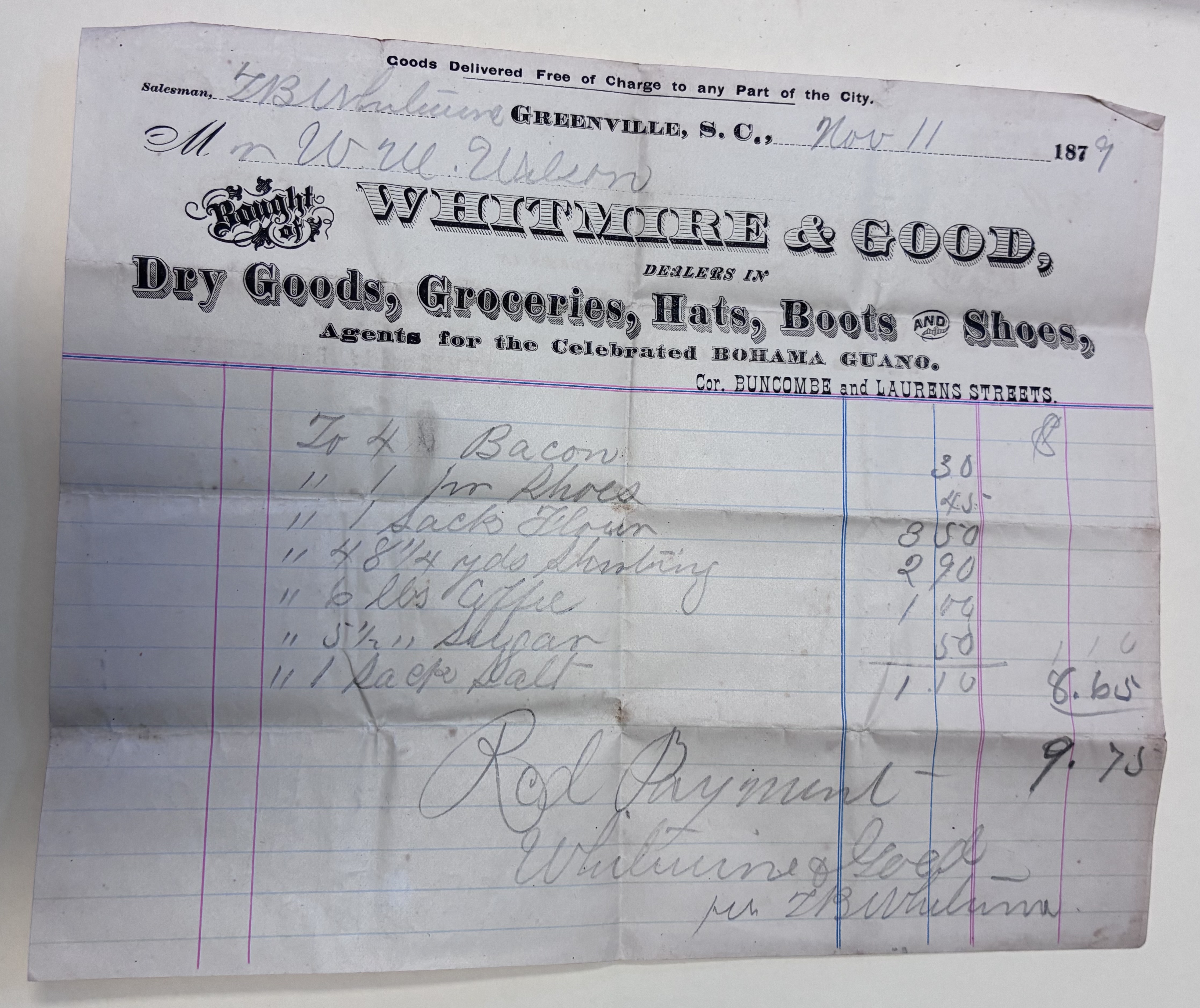 - Whitmire & Good Receipt, Greenville, S.C., November 11, 1879