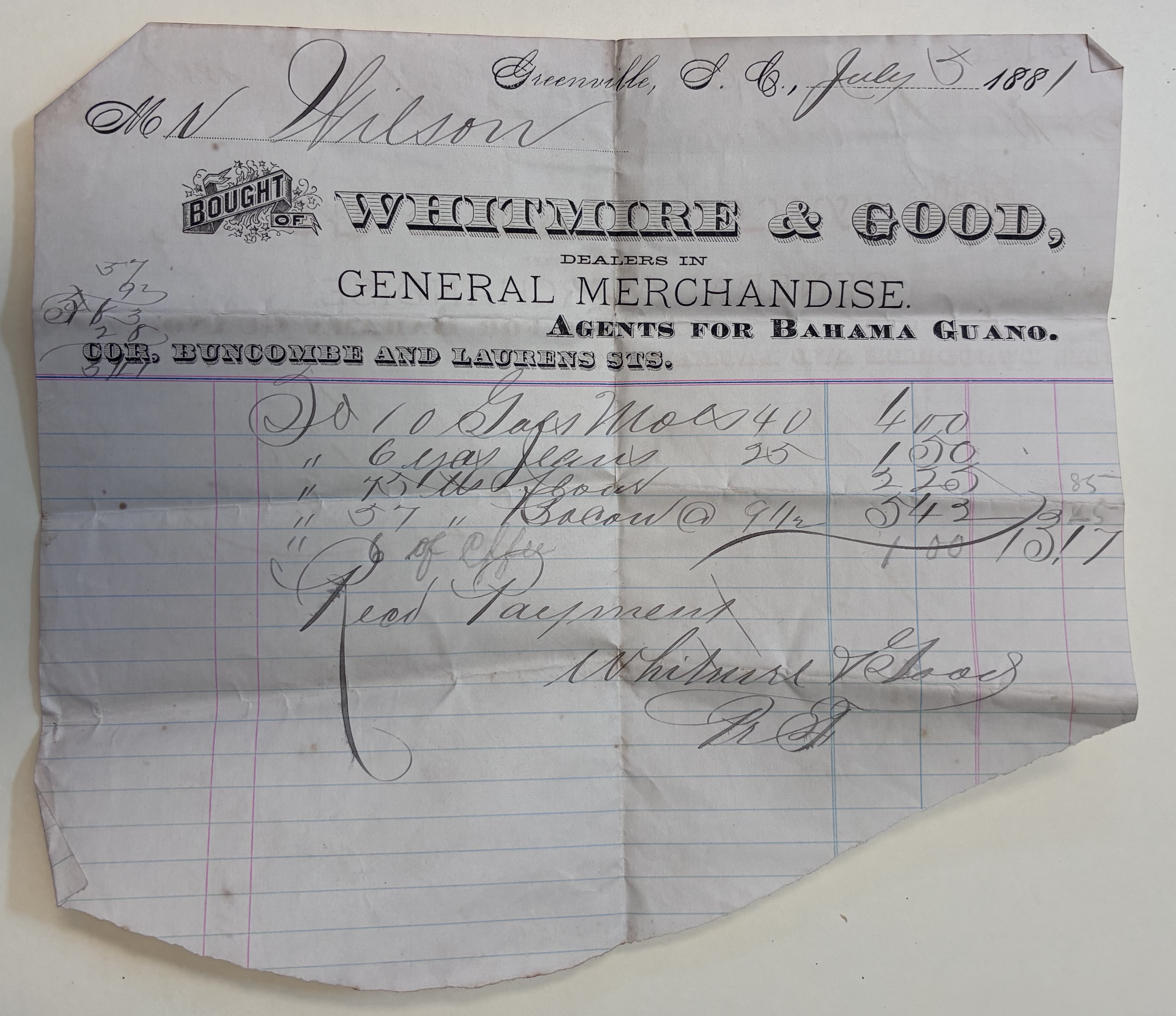 - Whitmire & Good Receipt, Greenville, S.C., July 5, 1881