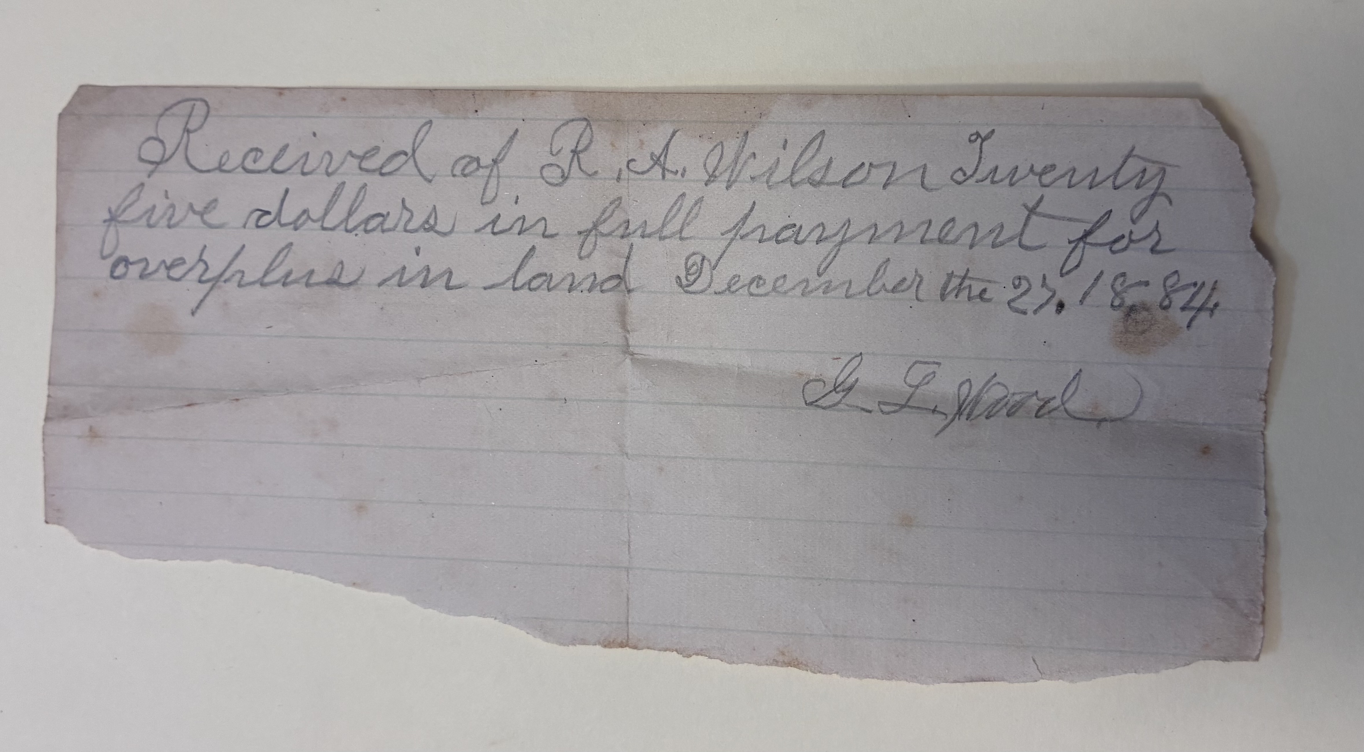 Received of R.A. Wilson Twenty five dollars in full payment for over plus in land December the 27, 1884.