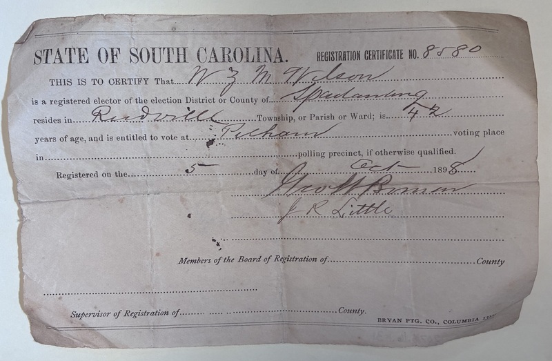 State of South Carolina Elector Registration Certificate for W.Z.M. Wilson, October 5, 1898
