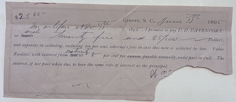 Payment Promise Note from W.J.M Wilson to D.D. Davenport, June 11, 1895