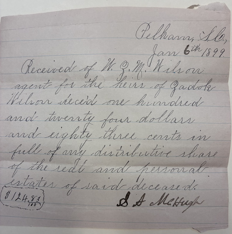 Receipt from Zadok Estate, Pelham S.C., January 6,1899