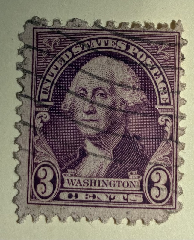 Used 3 Cents US Postage Stamp Purple with George Washington on it