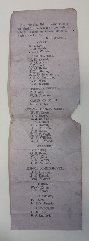 List of the candidates: Senate, Legislature, Probate Judge, Clerk of Court, County Commissioners, Sheriff, School Commissioner, Coroner, Auditor, Treasurer Candidats for 1888 written on the back