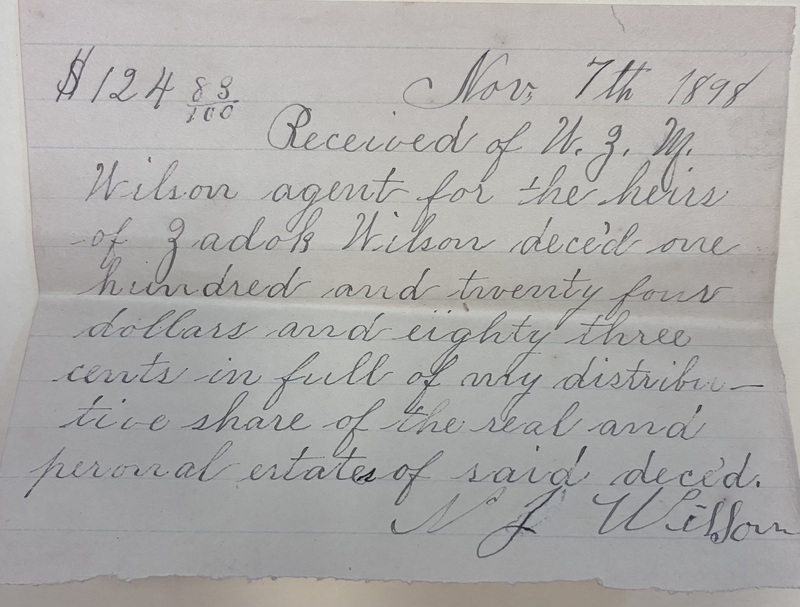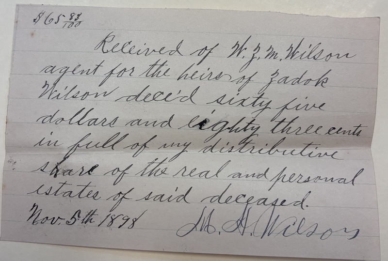 Receipt from Zadok Estate written by M.H. Wilson, November 5, 1898