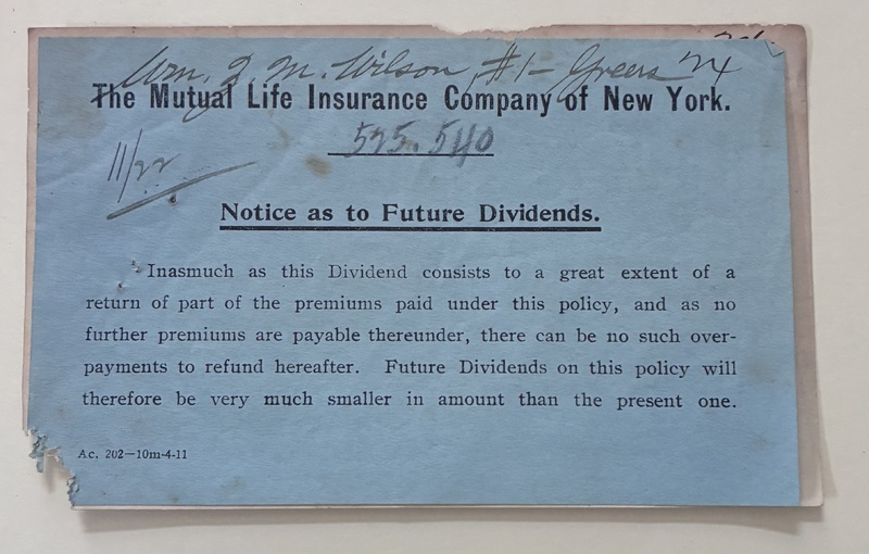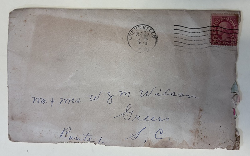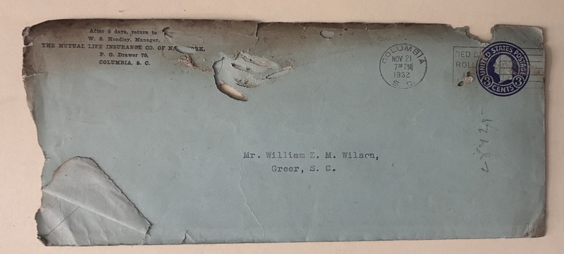 1: Blue Envelope from W.S. Hendley, Manager, The Mutual Life Insurance Co. of New York, to Mr. William Z.M. Wilson, Greer, S.C.