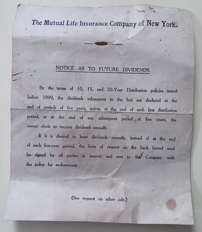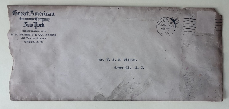 1: Envelope from W.S. Hendley, Manager, The Mutual Life Insurance Company of New York, to Mr. W.Z.M. Wilson, Greer, S.C.; The First American Life Insurance Company symbol on the back