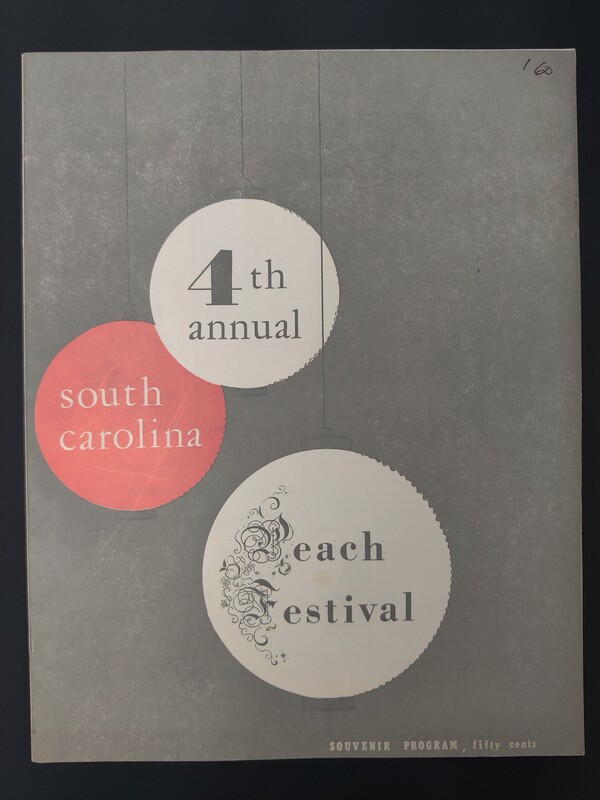 Verne Smith offers Peach Queen Martha Brannon a peach, observed by S. C. Farm Bureau Queen Adelaide Dennis and Bennie E. Gramling. This photo appears in a Greenville News article about the Peach Festival on June 12, 1958. Photographed by James G. Wilson