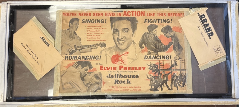 Grand Theater Memorabilia of Elvis Presley. This is a window display from the Grand Theater with posters and cards advertising Elvis Presley's movie Jailhouse Rock, playing at the theater; that would have been one of the last movies shown before the theatre closed (and possibly the very last). After the theatre closed down, Iris Day Staton removed the window with poster from the building; she was a fan of Elvis.