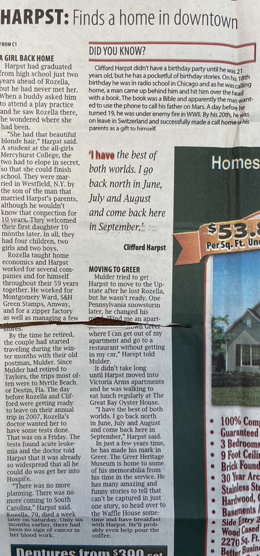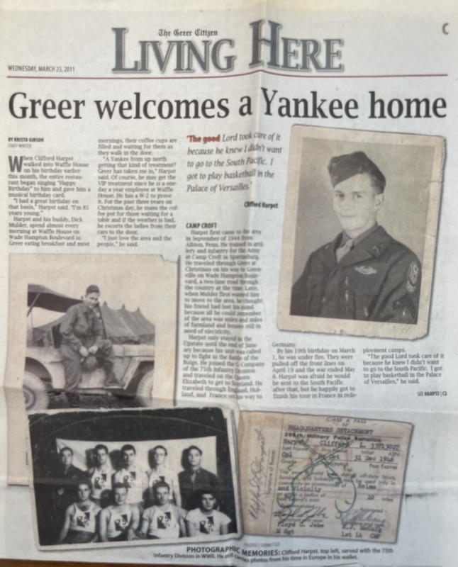 - Clifford Harpst was a WW2 veteran who trained at Camp Croft in Spartanburg and later retired to Greer, where he became a beloved and awarded member of the community.