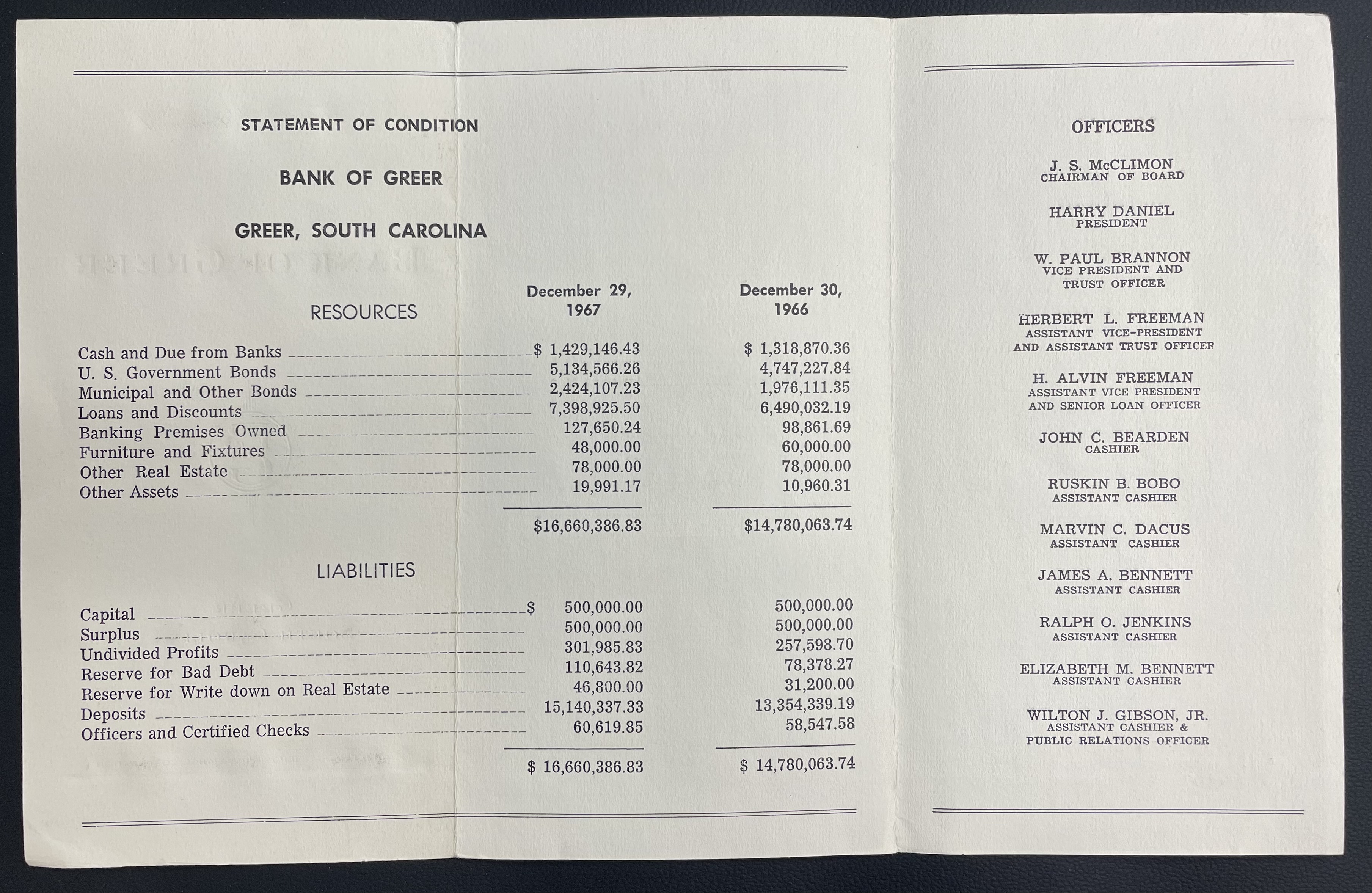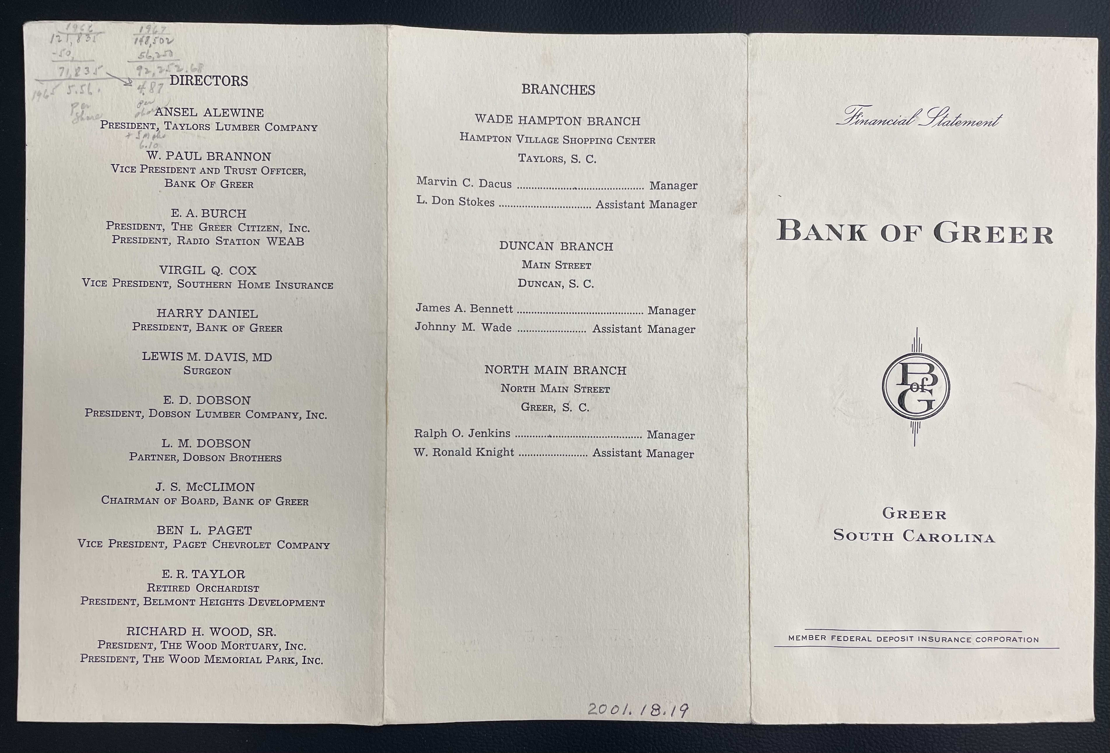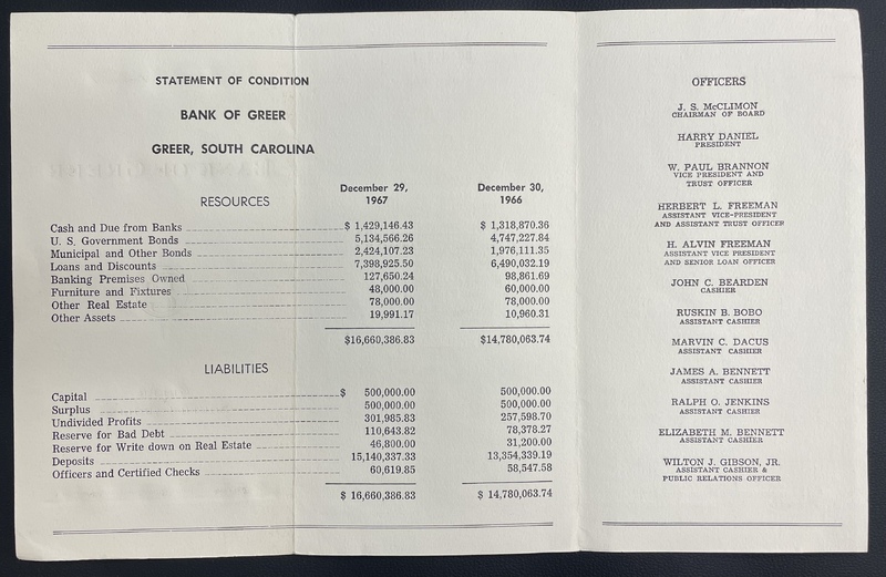 - Bank of Greer Bank Statement, 1967