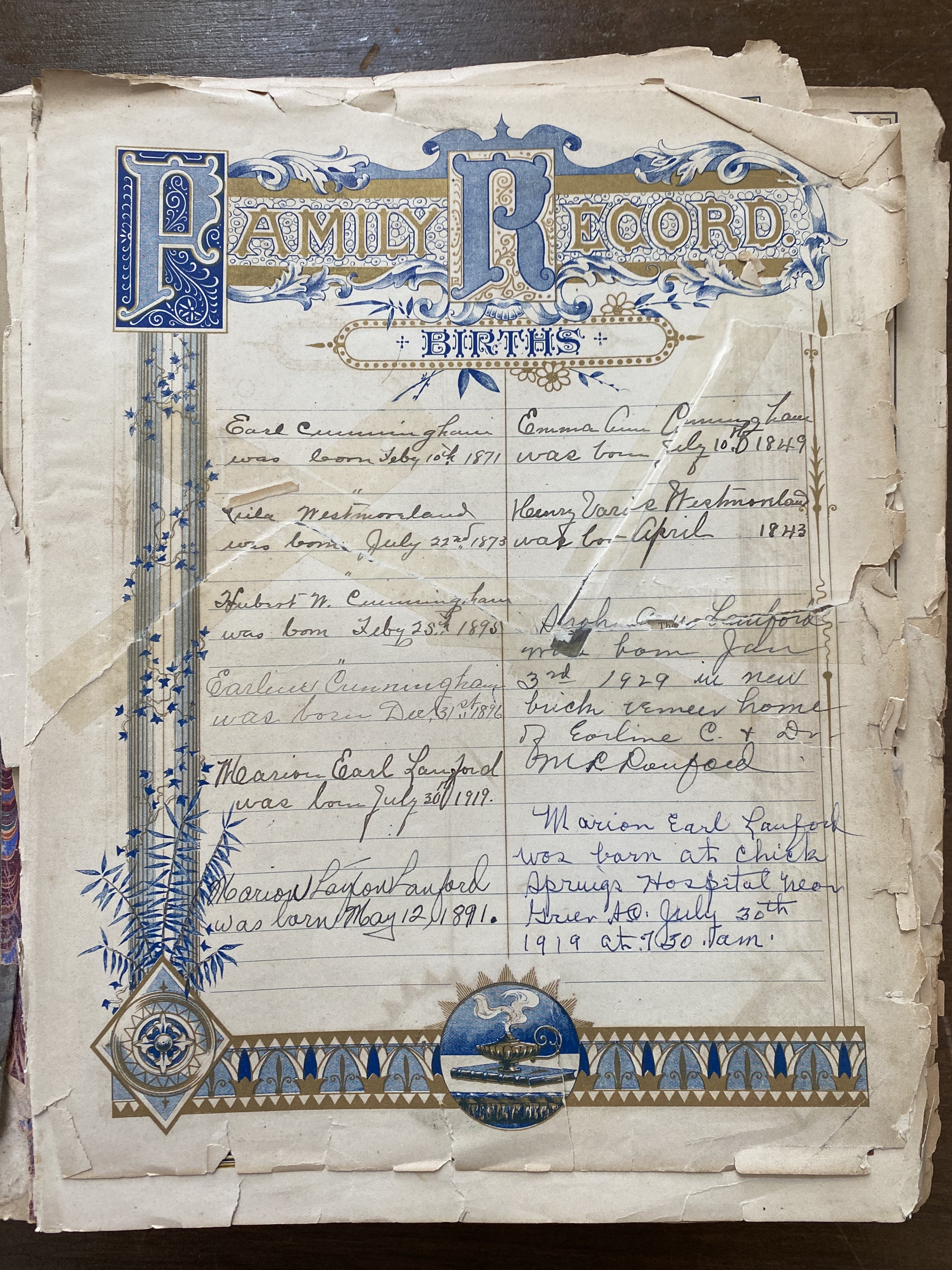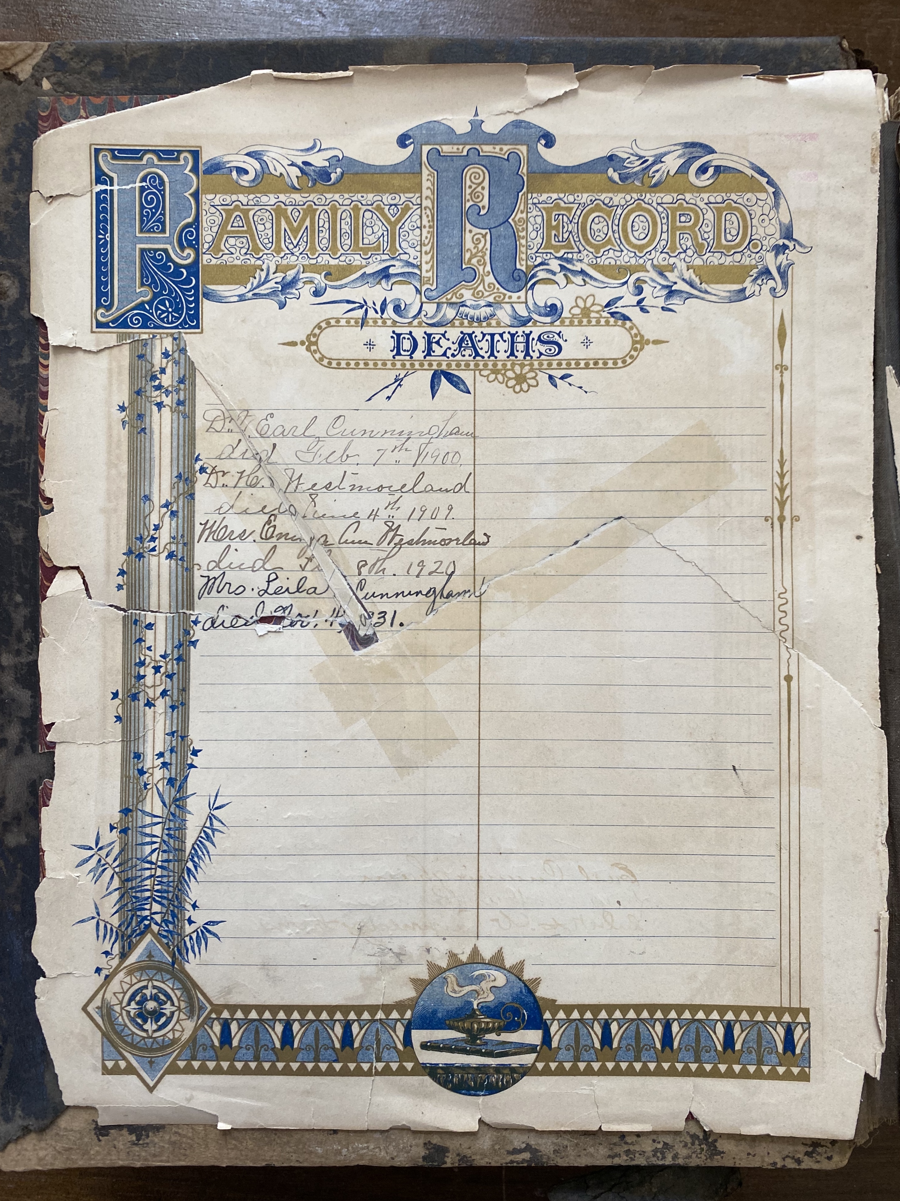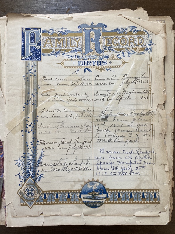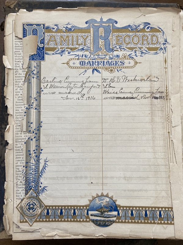 Large family Bible containing limited records of the Westmoreland, Cunningham, and Lanford families.